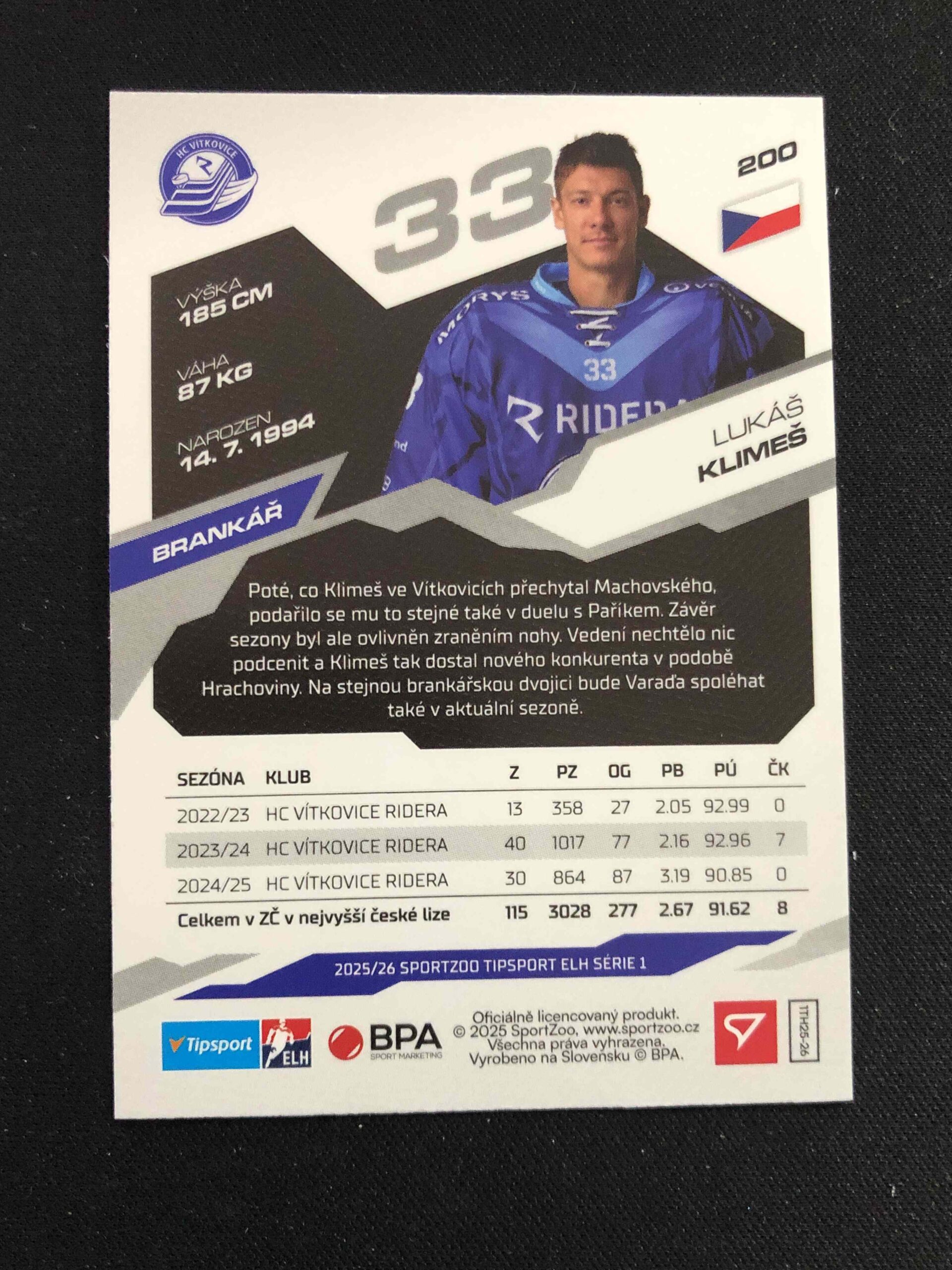 Sběratelská karta 2025/2026 Sportzoo Serie 1 Azure Blue 200 Lukáš Klimeš Paralel