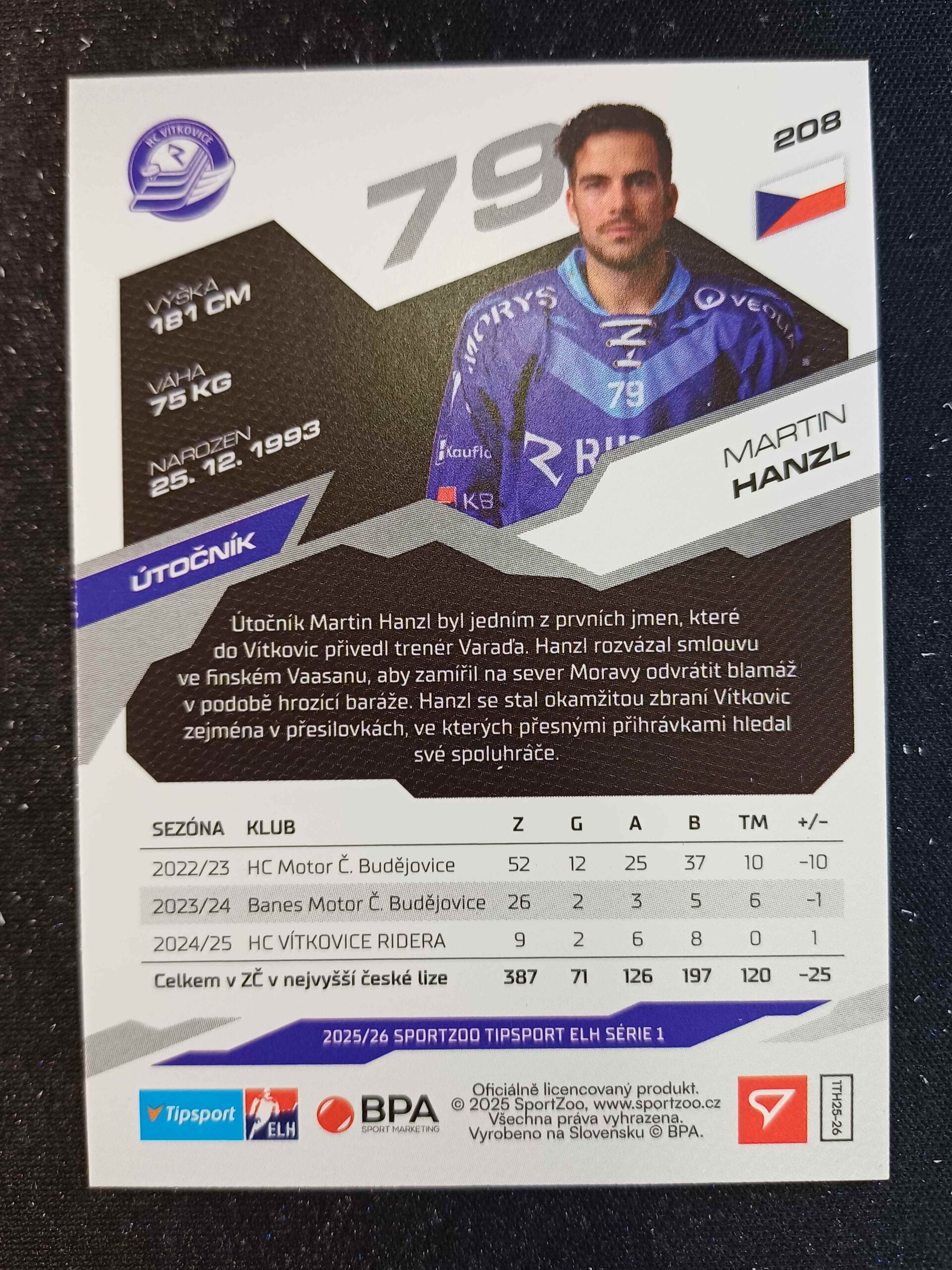 Sběratelská karta 2025/2026 Sportzoo Serie 1 Azure Blue 208 Martin Hanzl Paralel