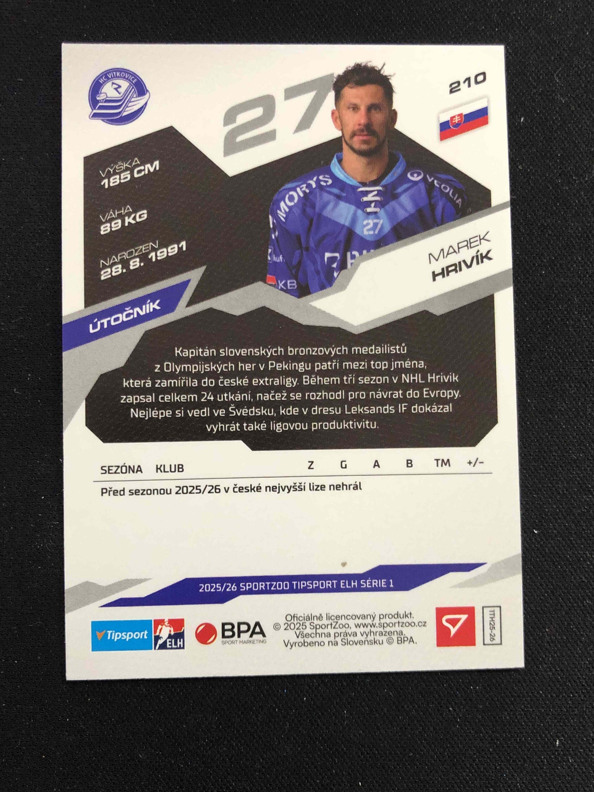 Sběratelská karta 2025/2026 Sportzoo Serie 1 Azure Blue 210 Marek Hrivík Paralel