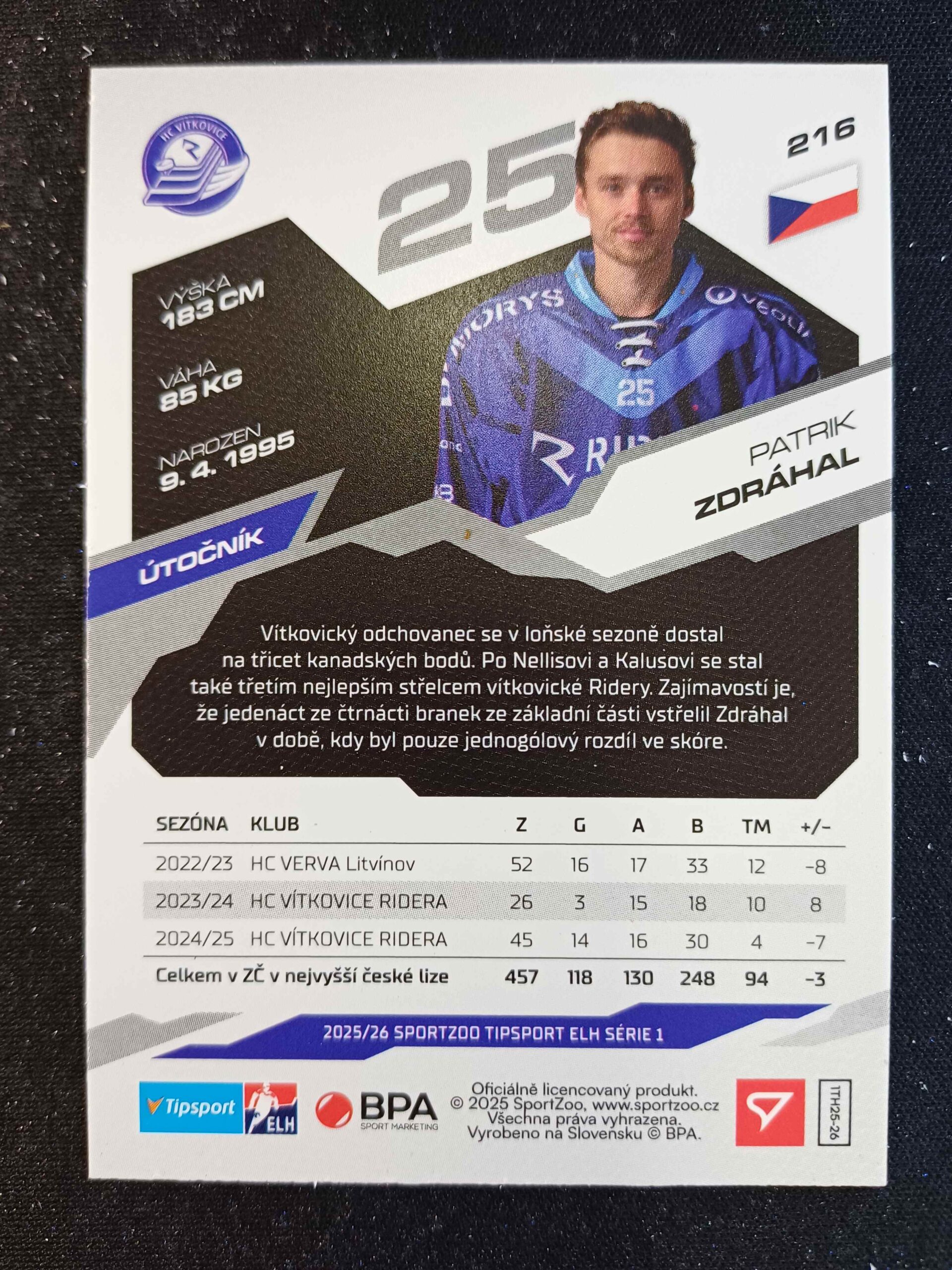 Sběratelská karta 2025/2026 Sportzoo Serie 1 Azure Blue 216 Patrik Zdráhal Paralel