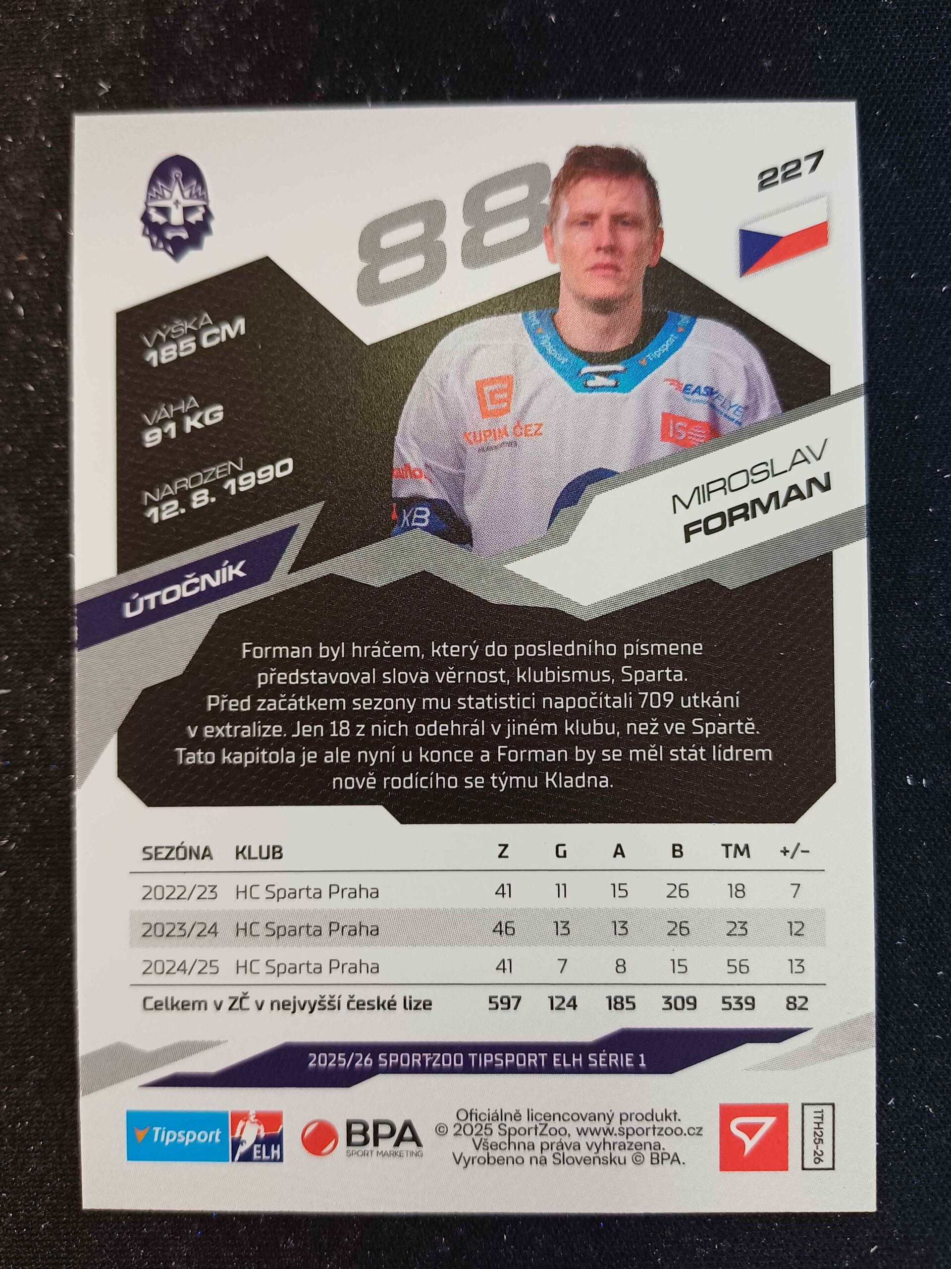Sběratelská karta 2025/2026 Sportzoo Serie 1 Azure Blue 227 Miroslav Forman Paralel