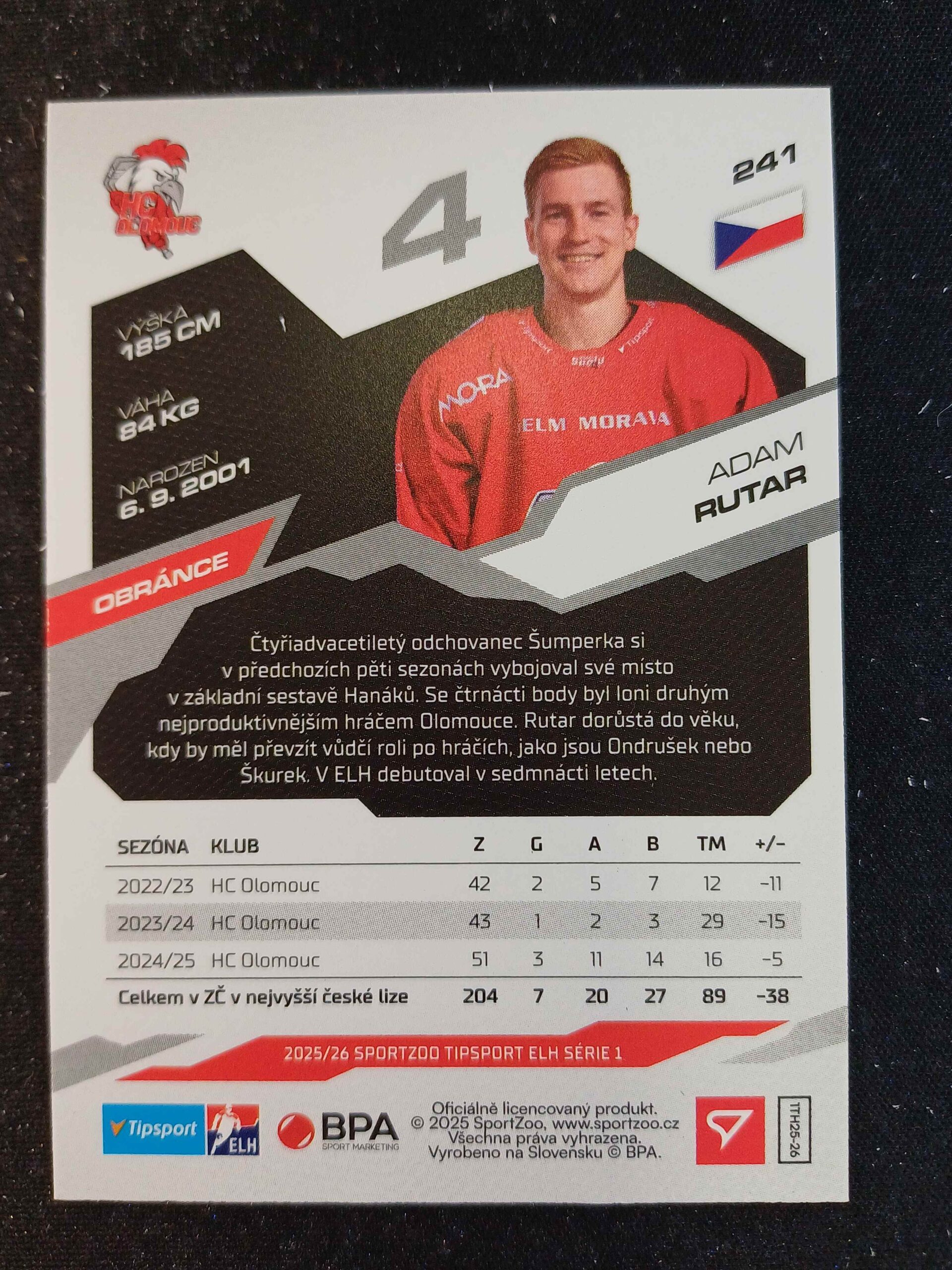 Sběratelská karta 2025/2026 Sportzoo Serie 1 Azure Blue 241 Adam Rutar Paralel