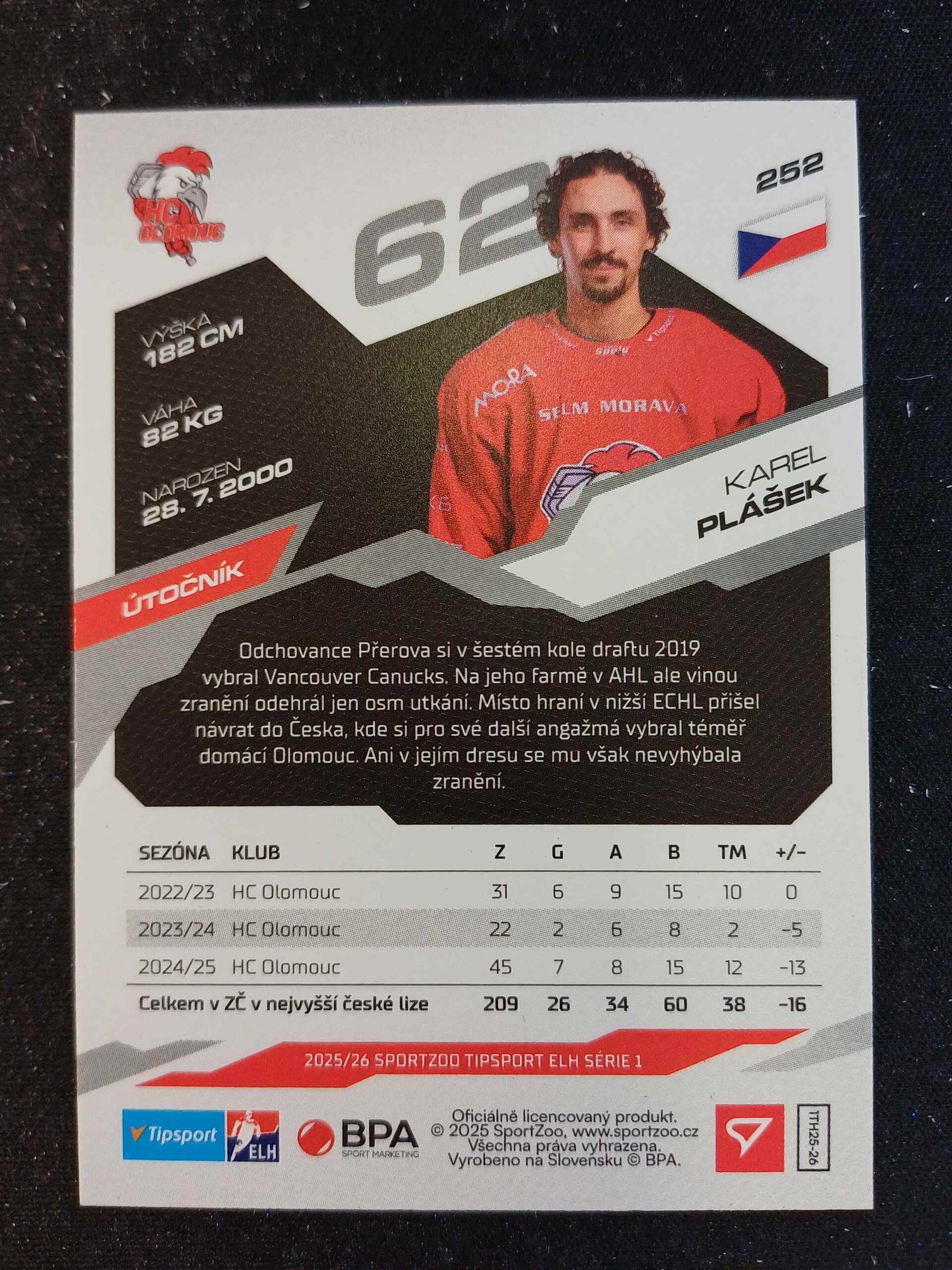 Sběratelská karta 2025/2026 Sportzoo Serie 1 Azure Blue 252 Karel Plášek Paralel
