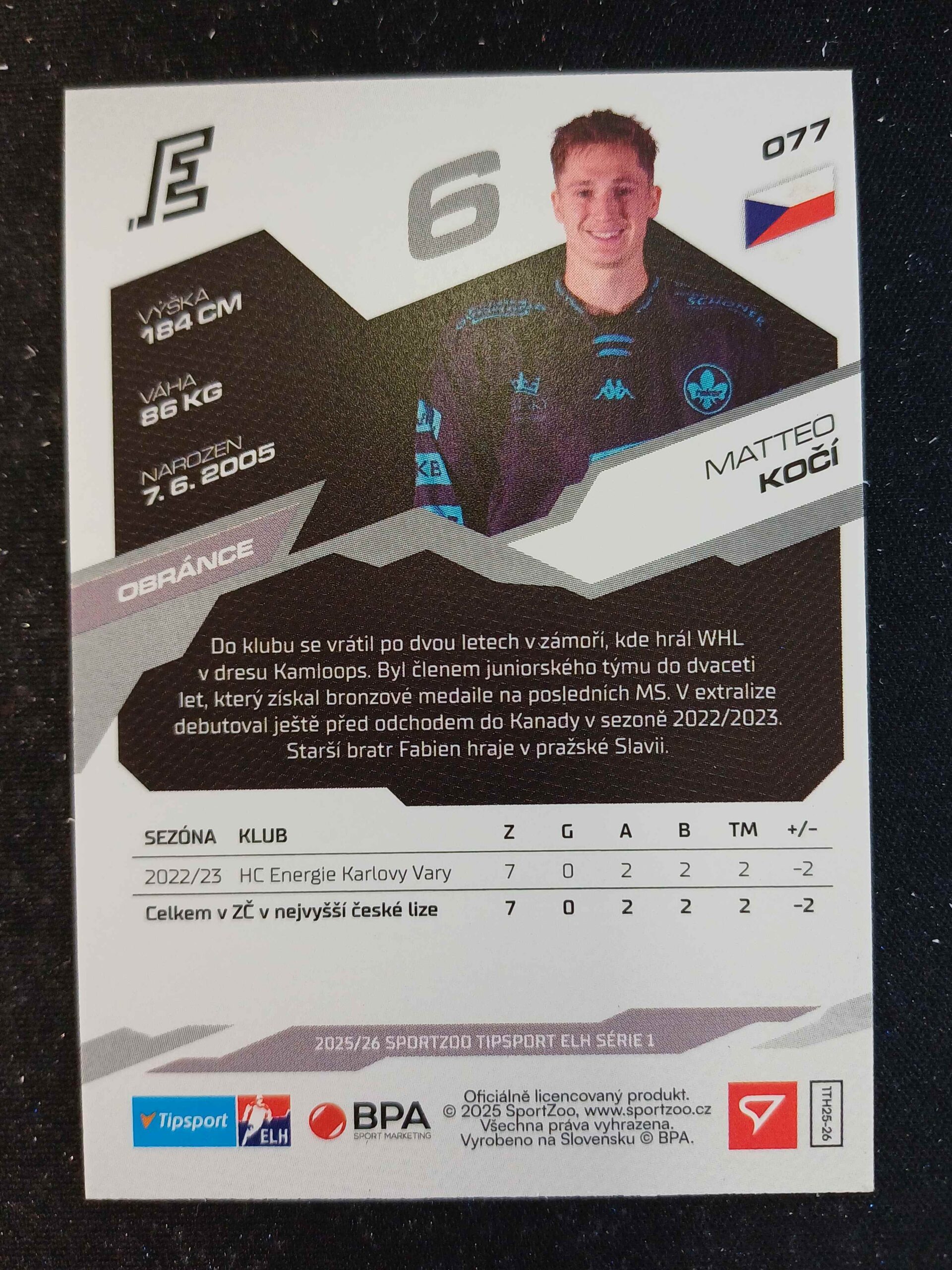 Sběratelská karta 2025/2026 Sportzoo Serie 1 Azure Blue 77 Matteo Kočí Paralel