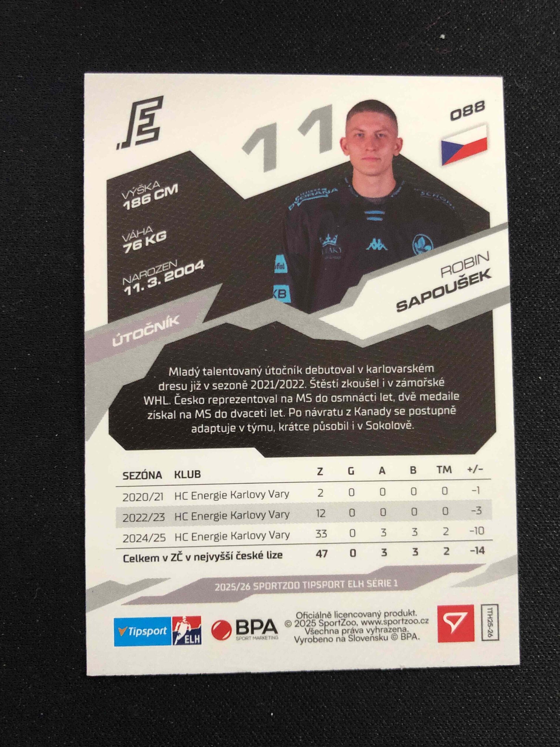 Sběratelská karta 2025/2026 Sportzoo Serie 1 Azure Blue 88 Robin Sapoušek Paralel