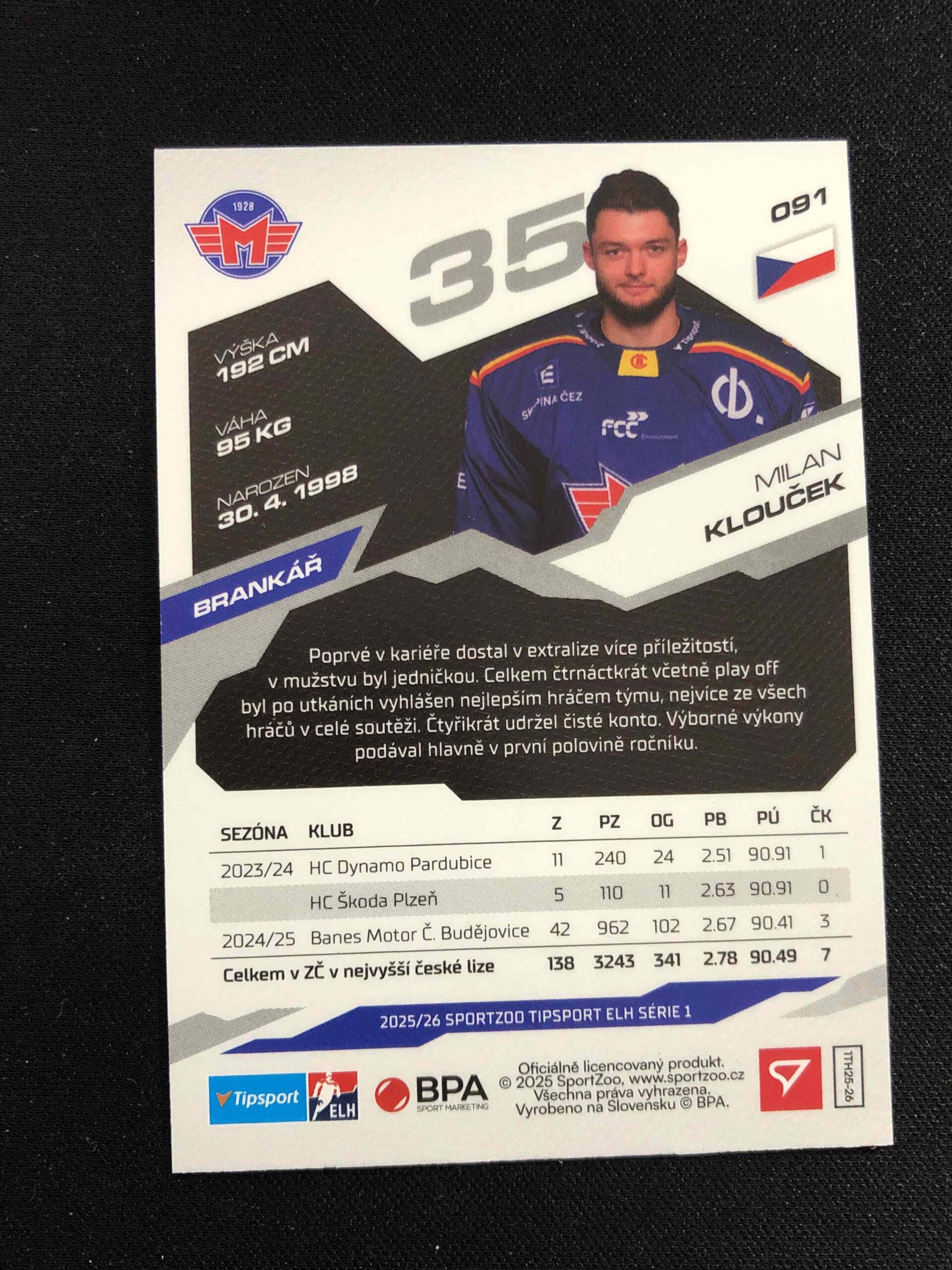 Sběratelská karta 2025/2026 Sportzoo Serie 1 Azure Blue 91 Milan Klouček Paralel