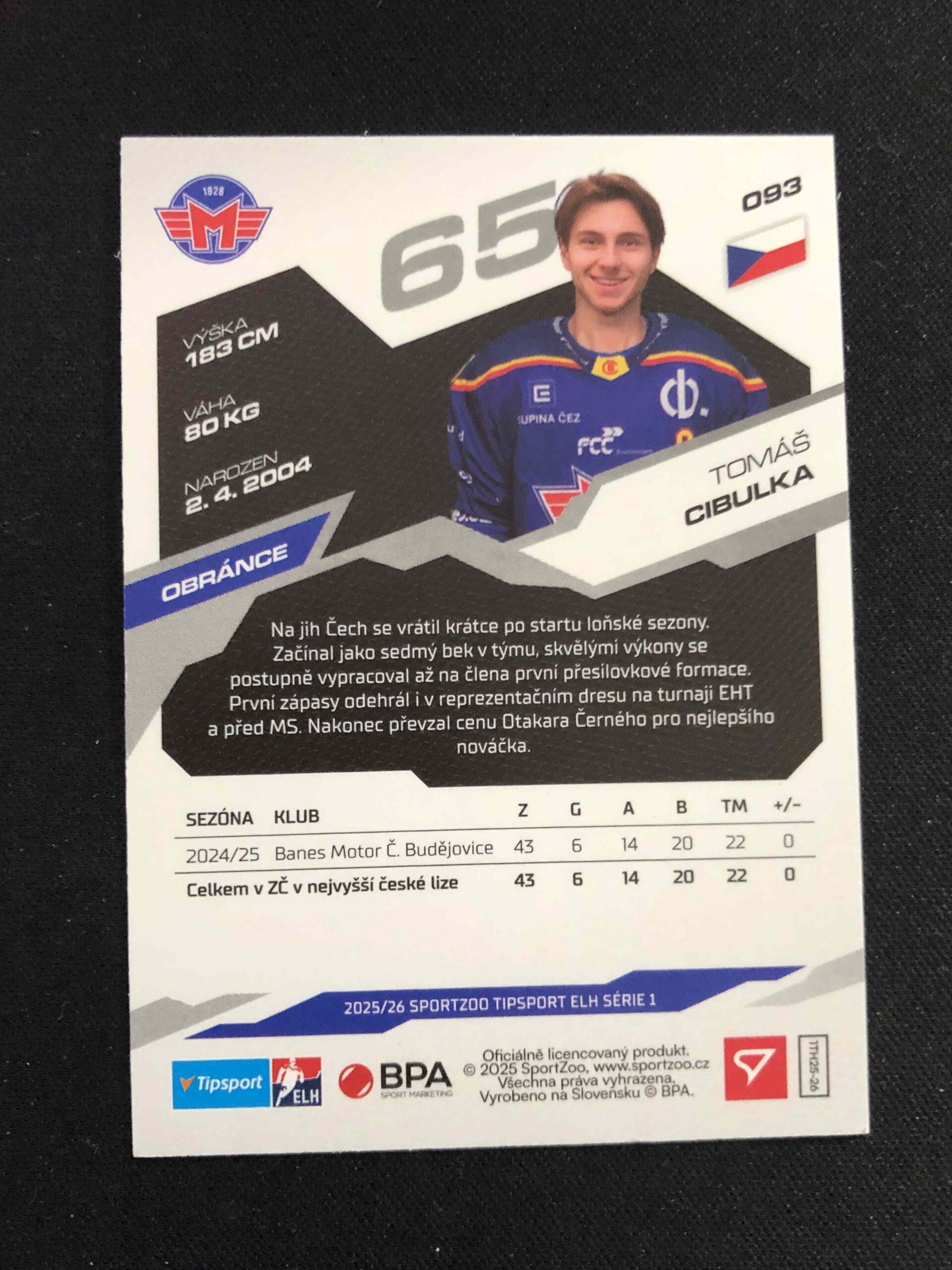 Sběratelská karta 2025/2026 Sportzoo Serie 1 Azure Blue 93 Tomáš Cibulka Paralel