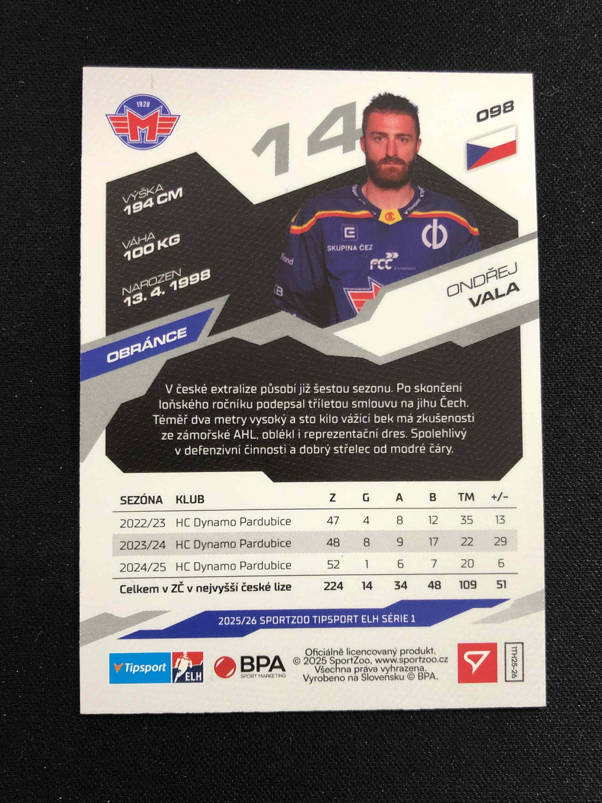 Sběratelská karta 2025/2026 Sportzoo Serie 1 Azure Blue 98 Ondřej Vála Paralel
