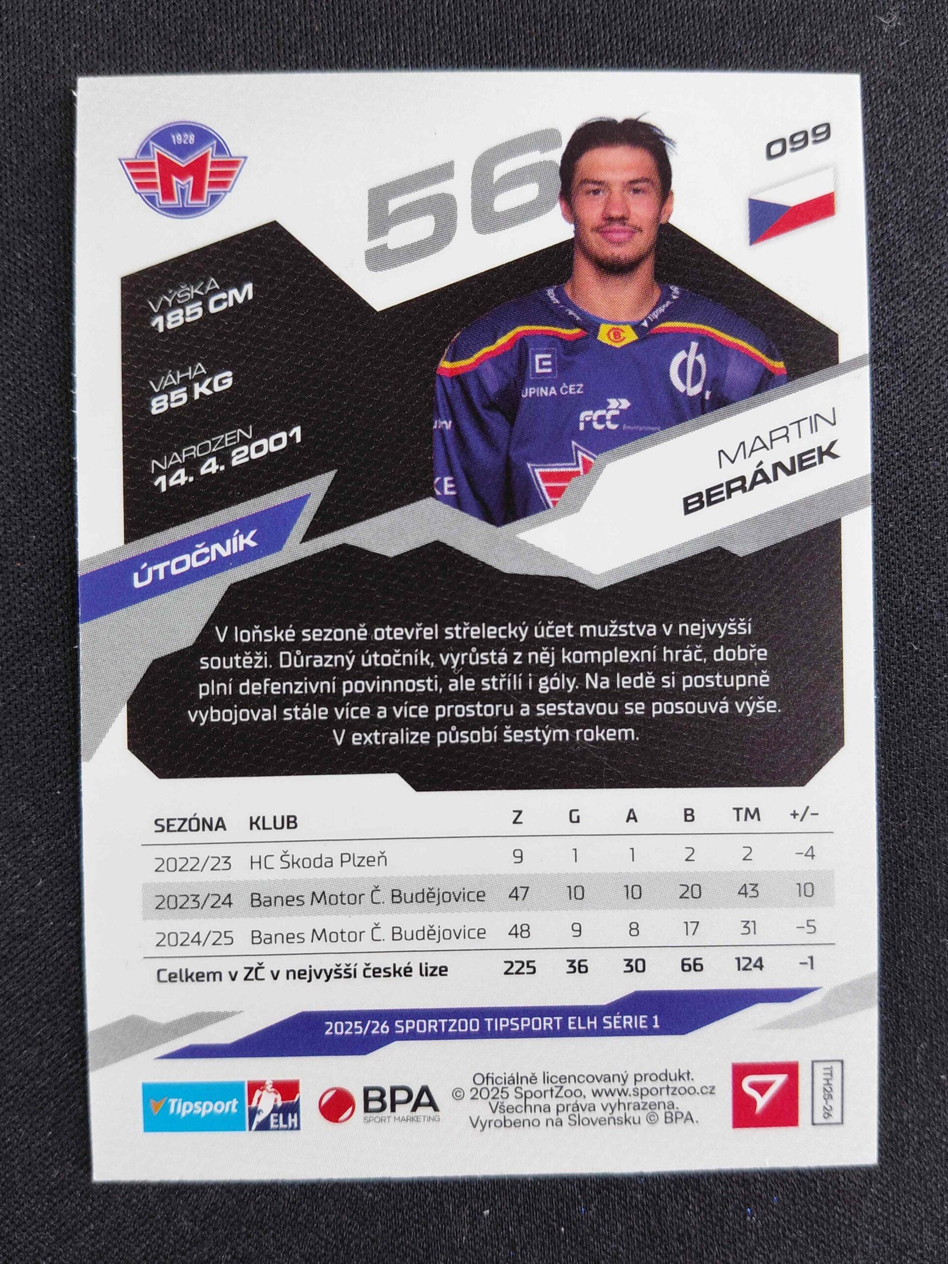 Sběratelská karta 2025/2026 Sportzoo Serie 1 Azure Blue 99 Martin Beránek Paralel