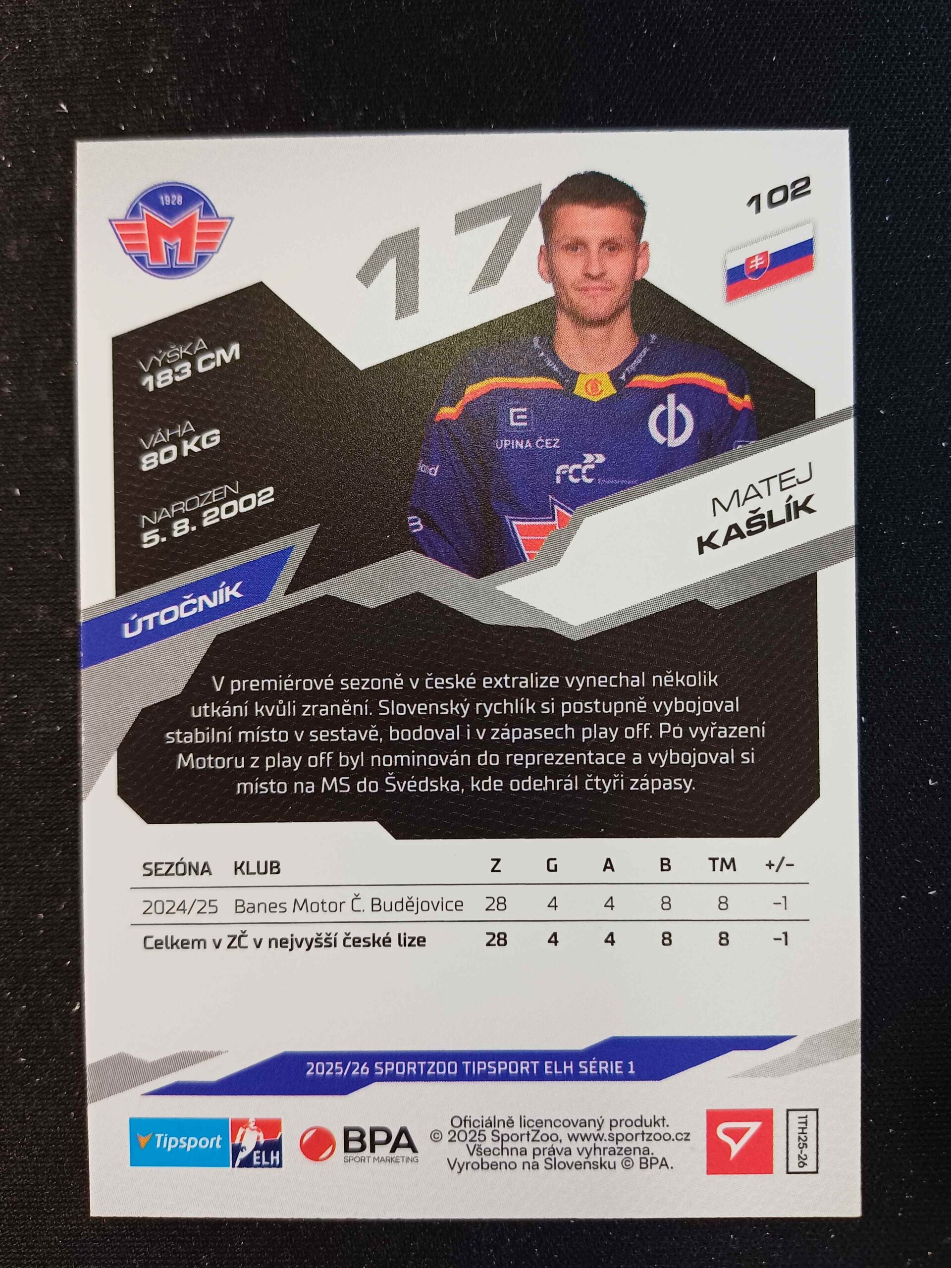 Sběratelská karta 2025/2026 Sportzoo Serie 1 Base 102 Matej Kašlík