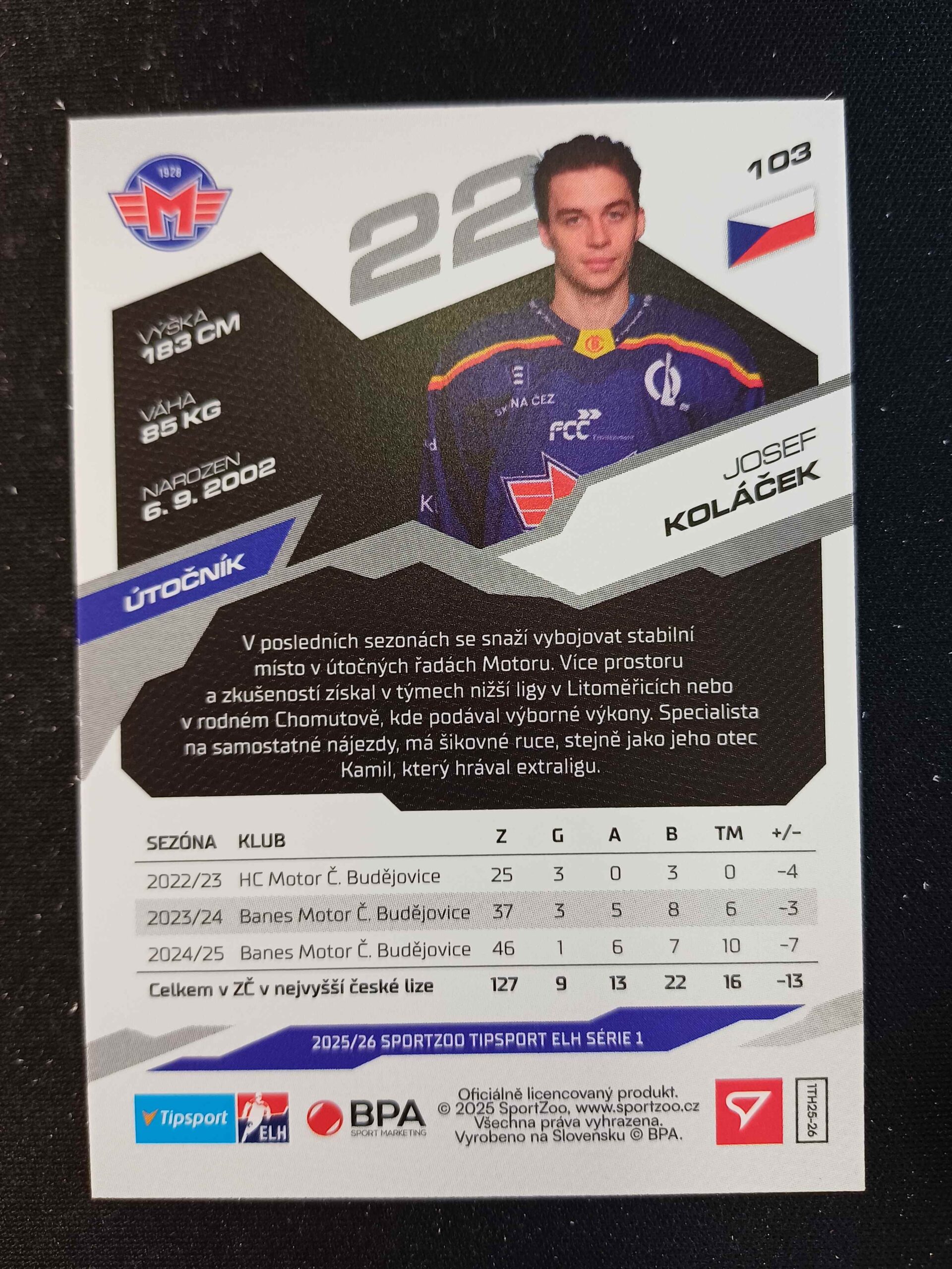 Sběratelská karta 2025/2026 Sportzoo Serie 1 Base 103 Josef Koláček