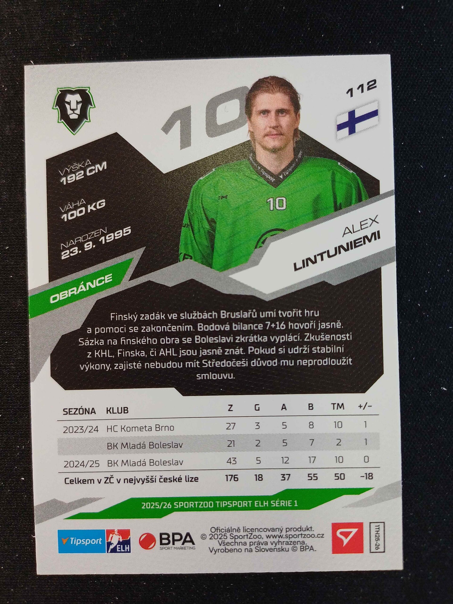 Sběratelská karta 2025/2026 Sportzoo Serie 1 Base 112 Alex Lintuniemi