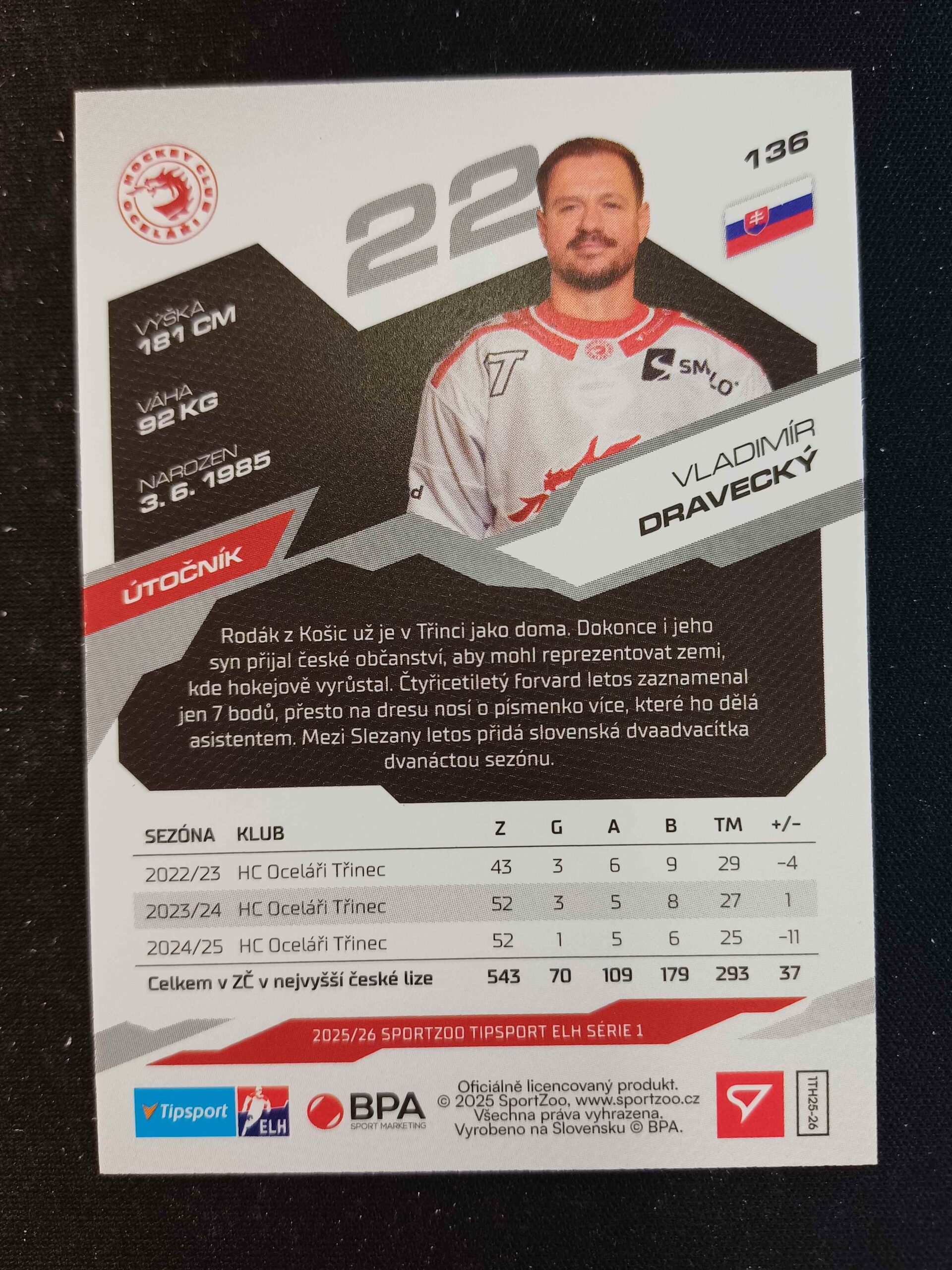 Sběratelská karta 2025/2026 Sportzoo Serie 1 Base 136 Vladimír Dravecký