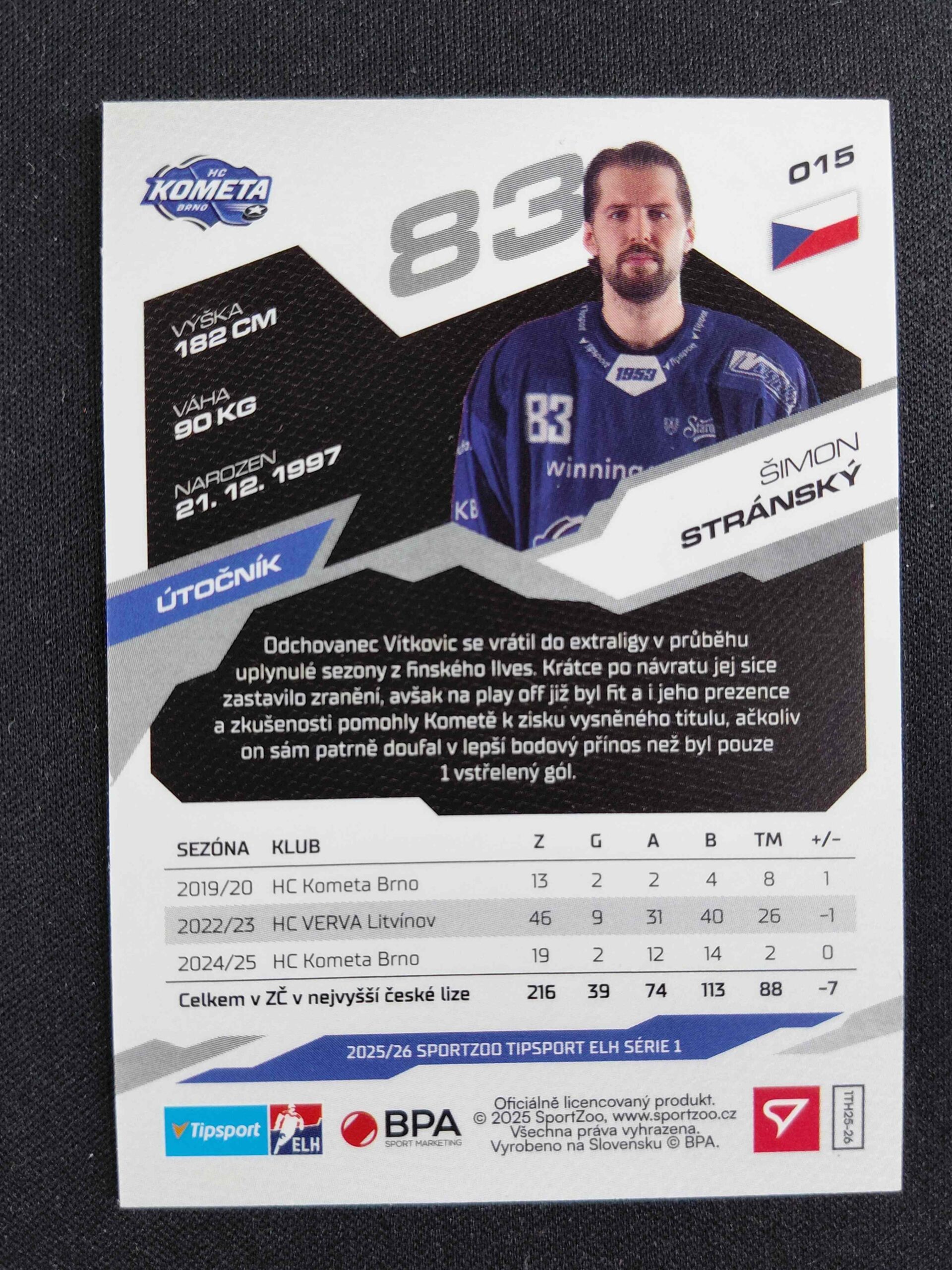 Sběratelská karta 2025/2026 Sportzoo Serie 1 Base 15 Šimon Stránský