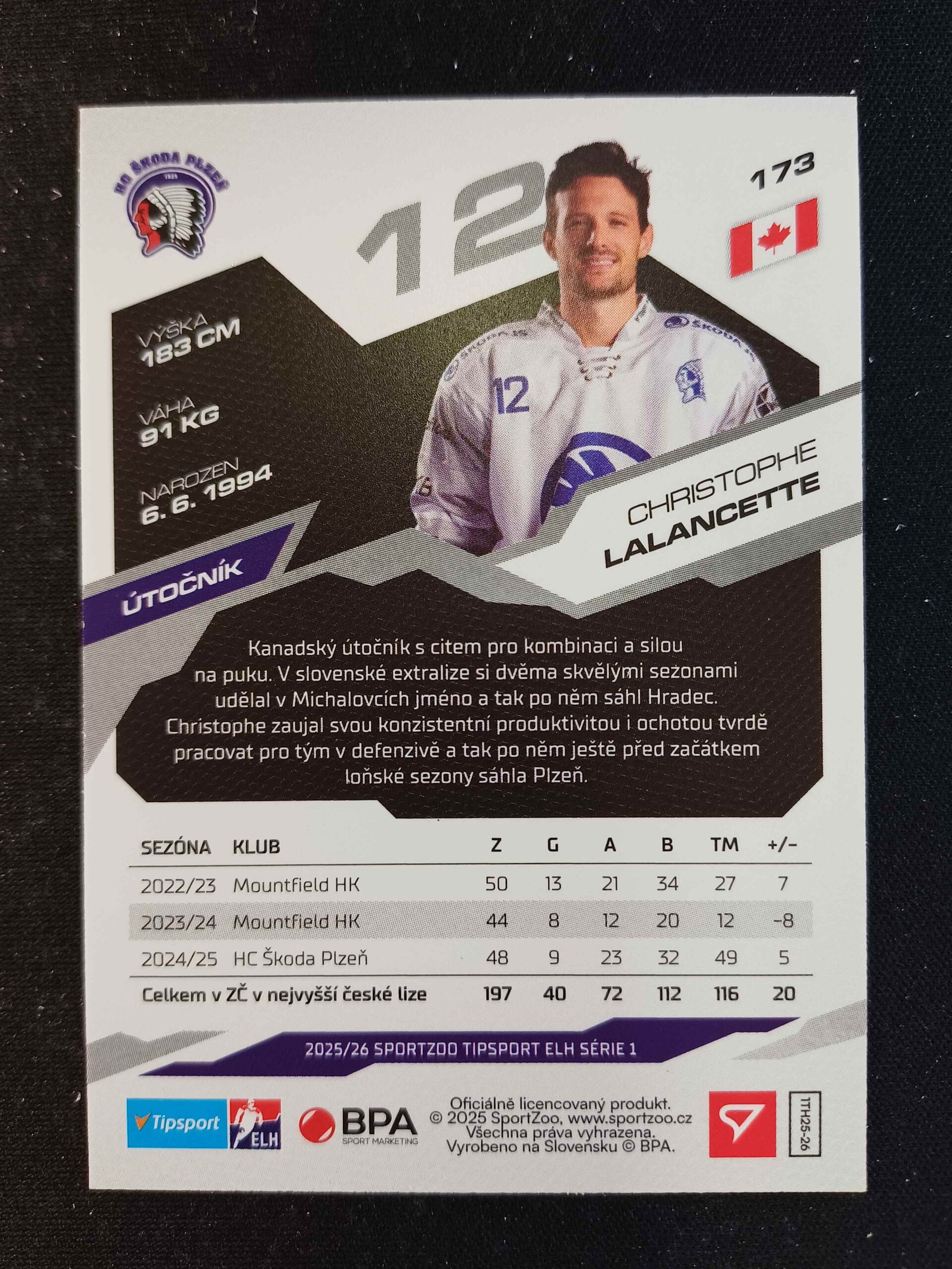 Sběratelská karta 2025/2026 Sportzoo Serie 1 Base 173 Christophe Lalancette