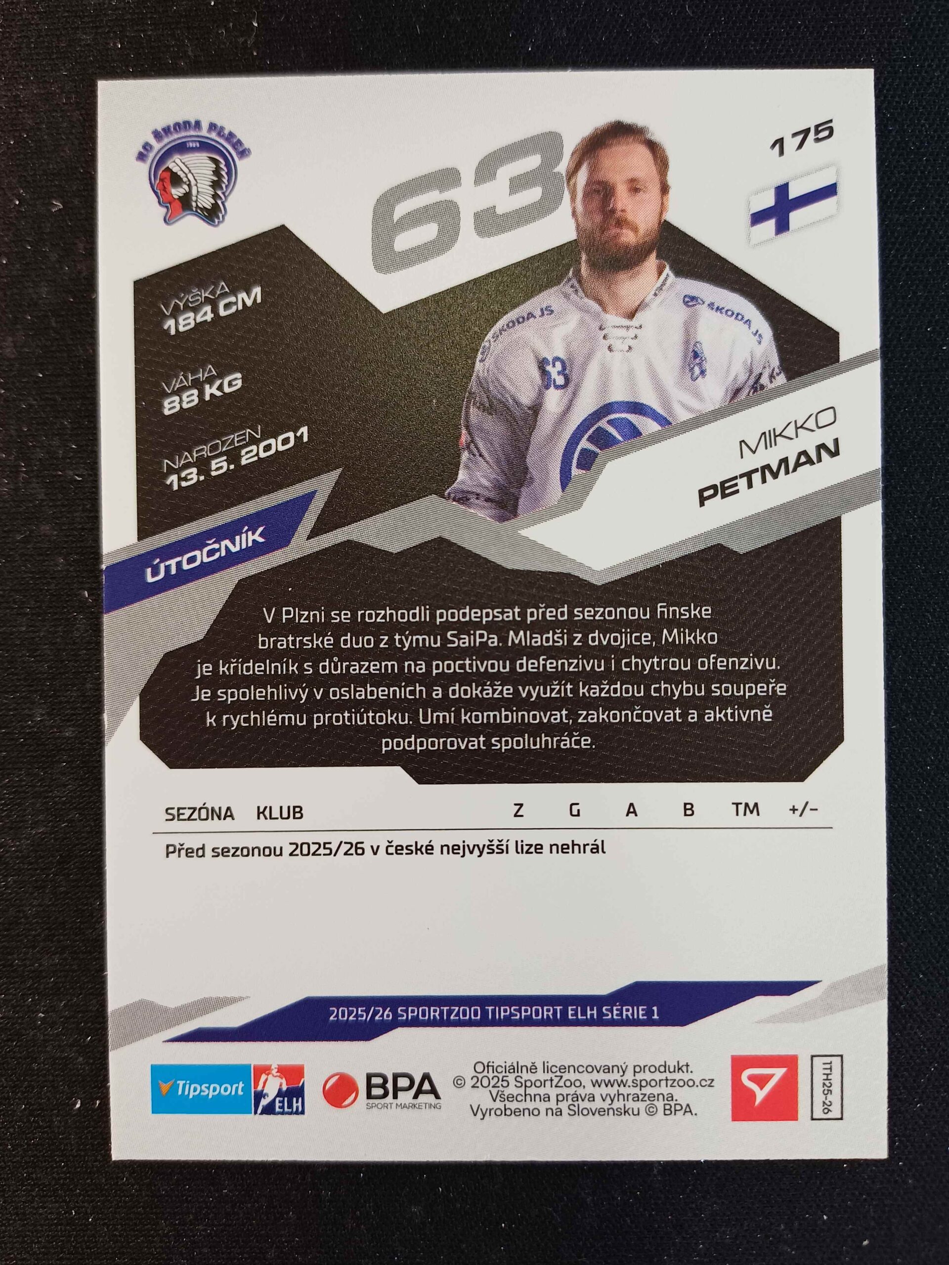 Sběratelská karta 2025/2026 Sportzoo Serie 1 Base 175 Mikko Petman