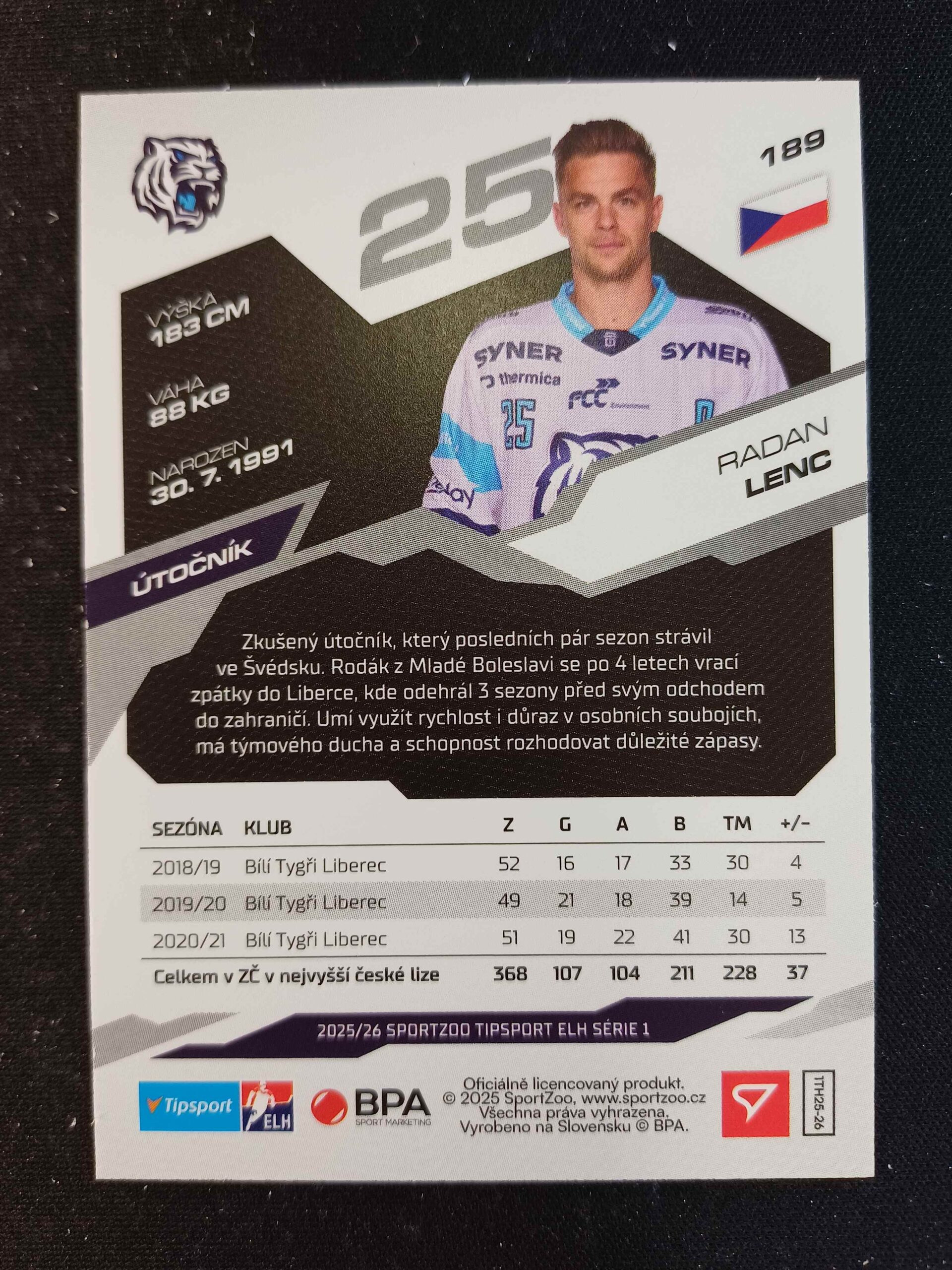 Sběratelská karta 2025/2026 Sportzoo Serie 1 Base 189 Radan Lenc