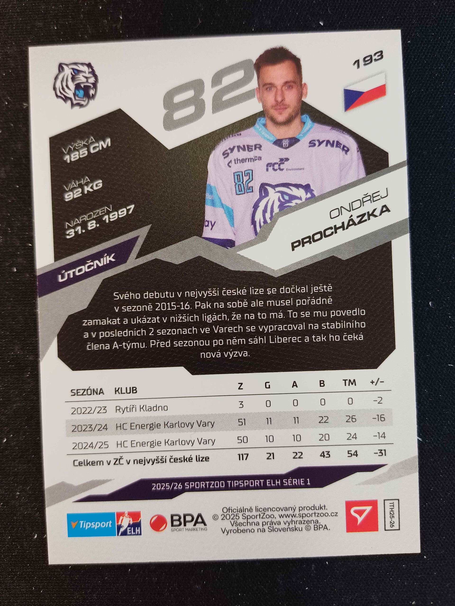 Sběratelská karta 2025/2026 Sportzoo Serie 1 Base 193 Ondřej Procházka