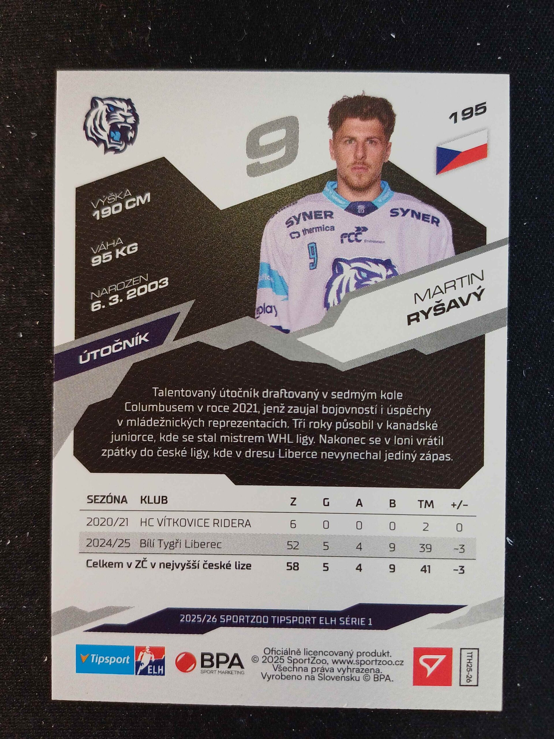 Sběratelská karta 2025/2026 Sportzoo Serie 1 Base 195 Martin Ryšavý