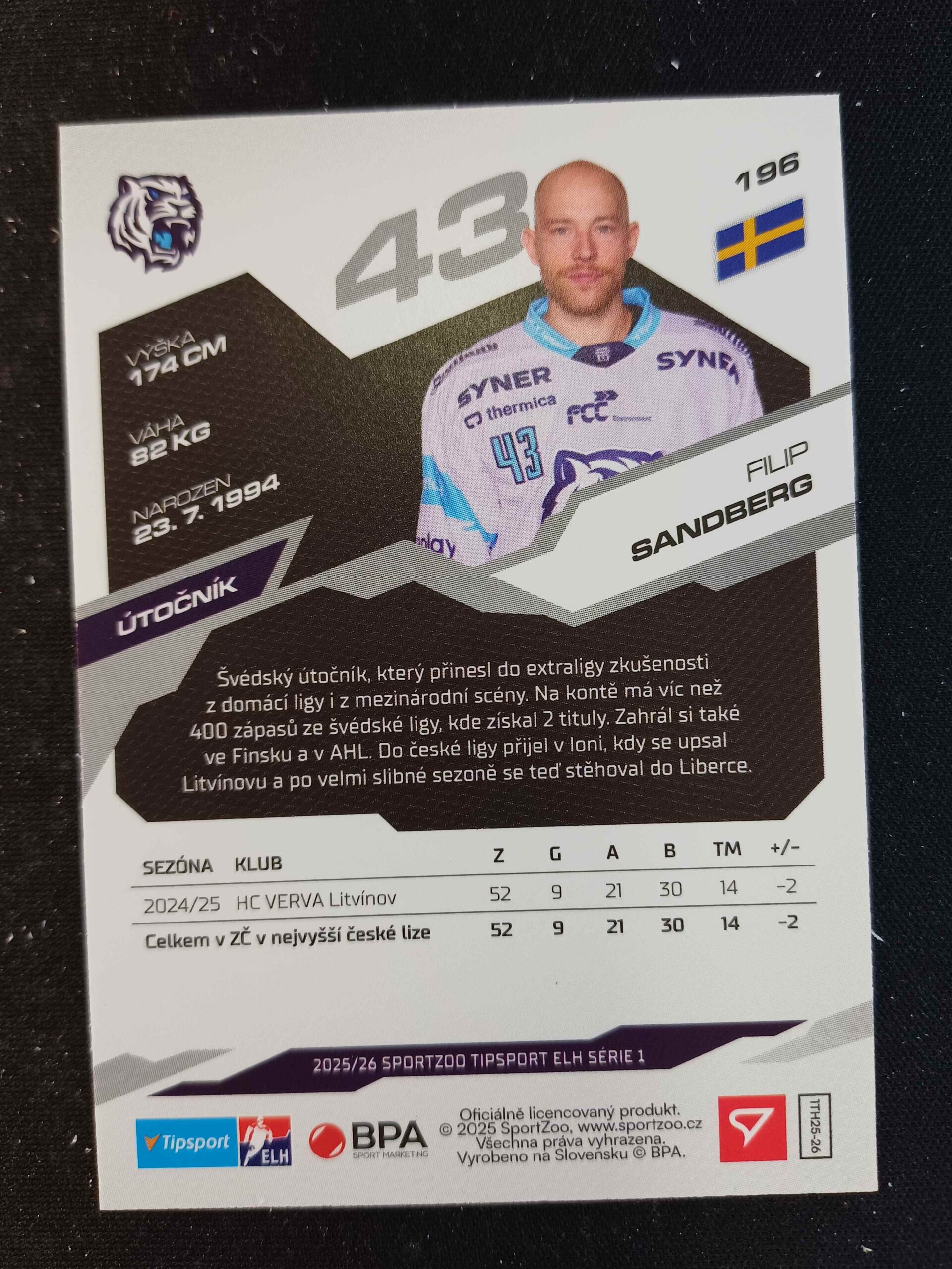 Sběratelská karta 2025/2026 Sportzoo Serie 1 Base 196 Filip Sandberg