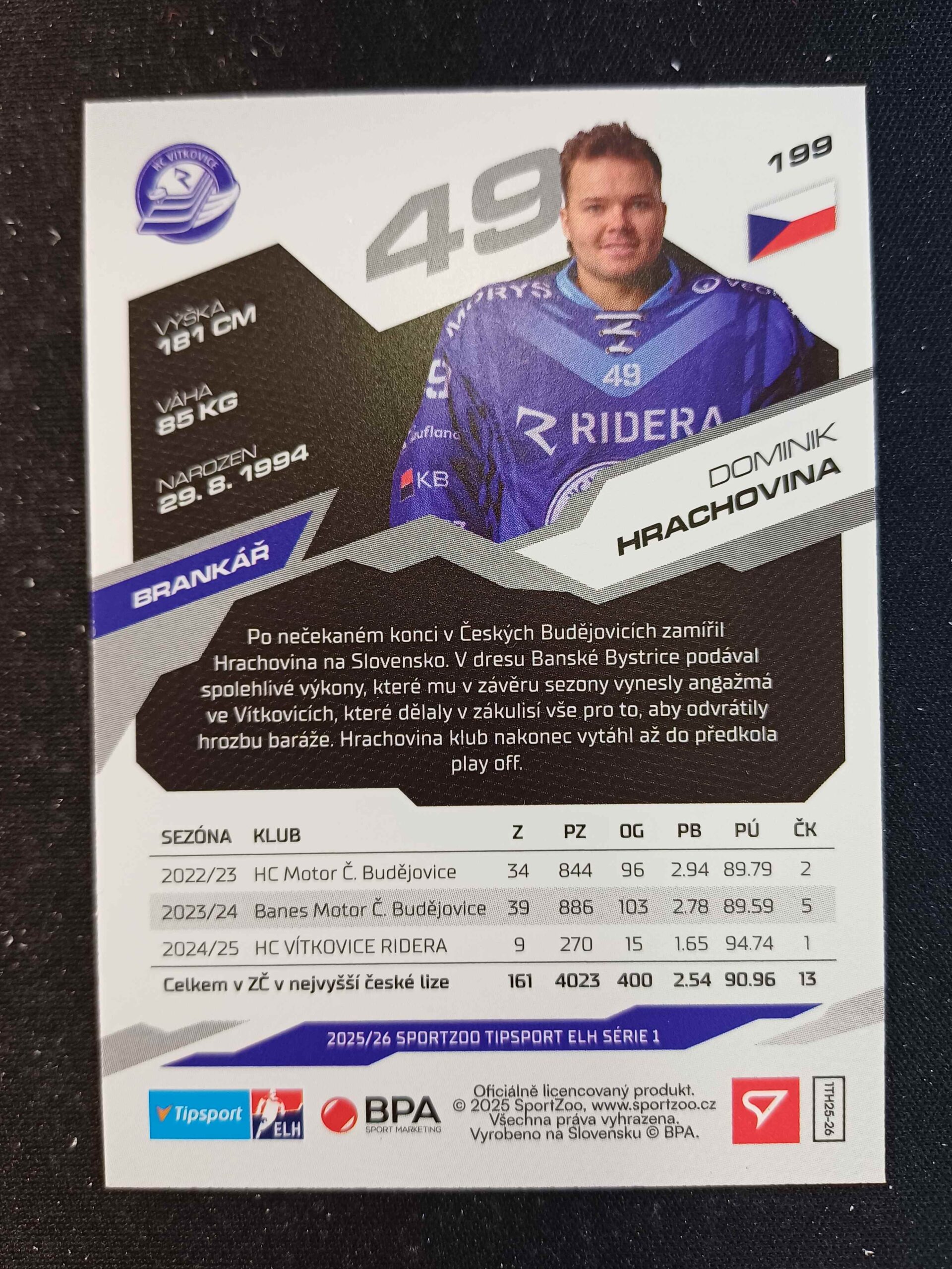 Sběratelská karta 2025/2026 Sportzoo Serie 1 Base 199 Dominik Hrachovina