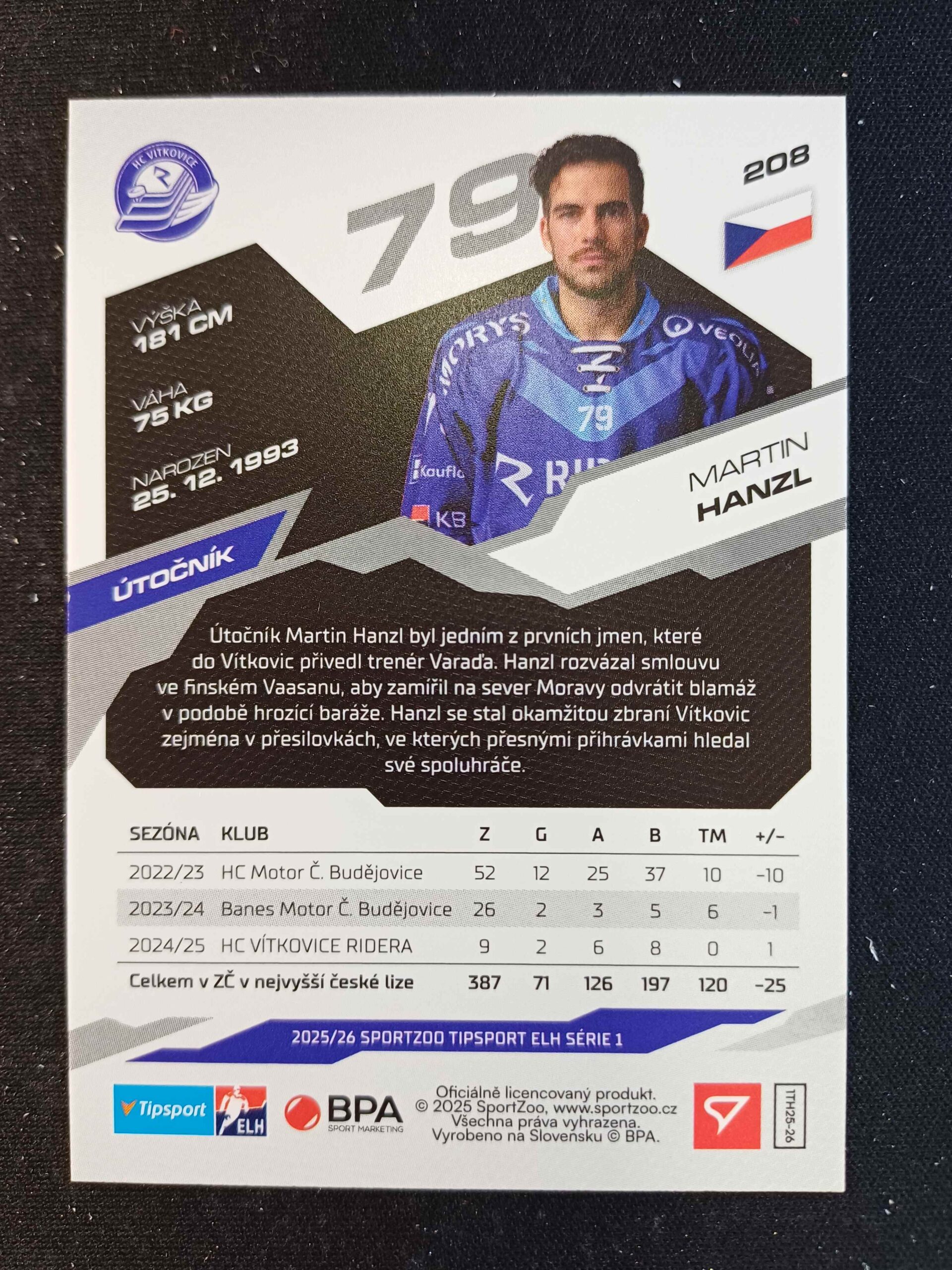 Sběratelská karta 2025/2026 Sportzoo Serie 1 Base 208 Martin Hanzl