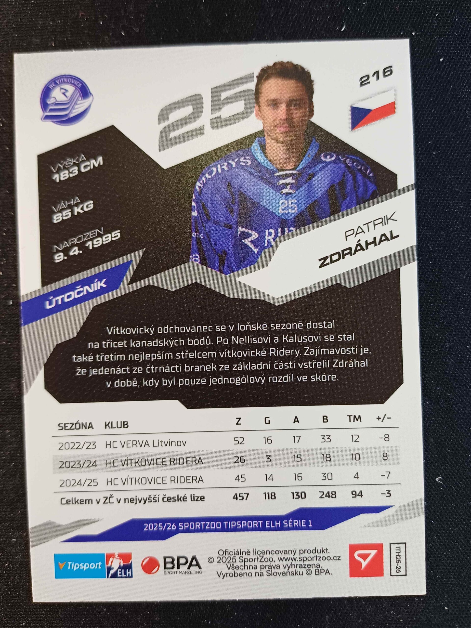 Sběratelská karta 2025/2026 Sportzoo Serie 1 Base 216 Patrik Zdráhal