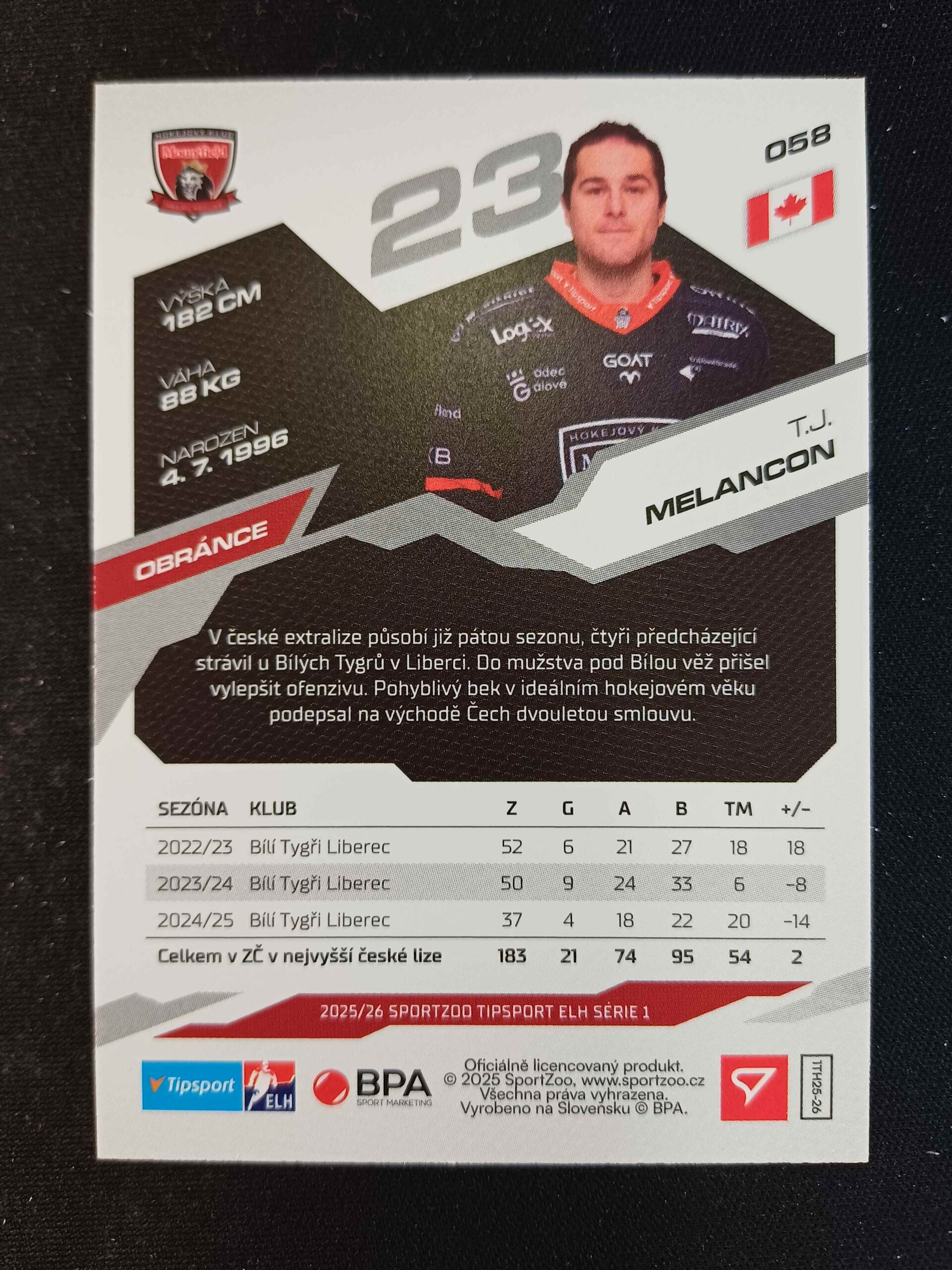 Sběratelská karta 2025/2026 Sportzoo Serie 1 Base 58 T.J. Melancon