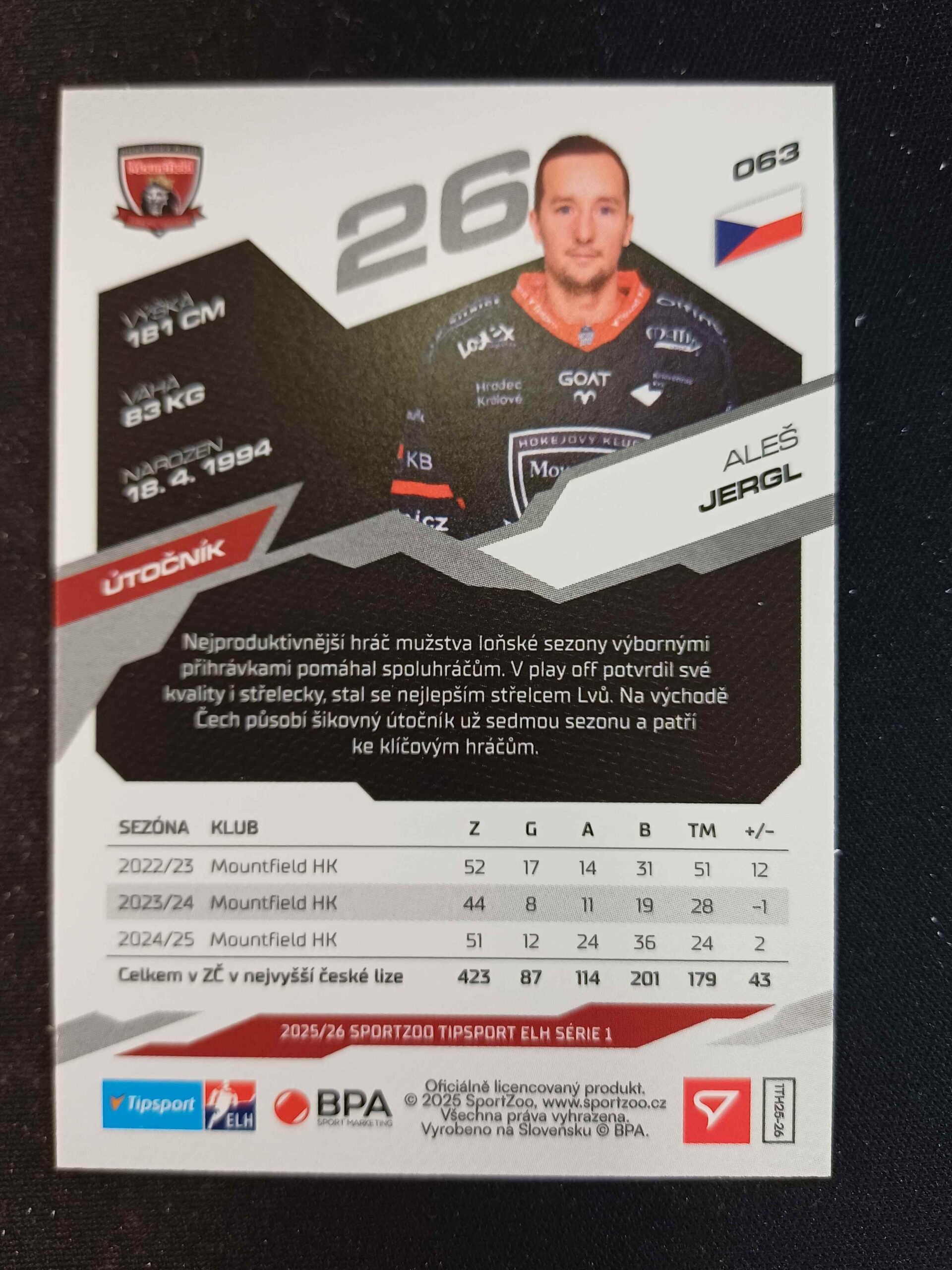 Sběratelská karta 2025/2026 Sportzoo Serie 1 Base 63 Aleš Jergl