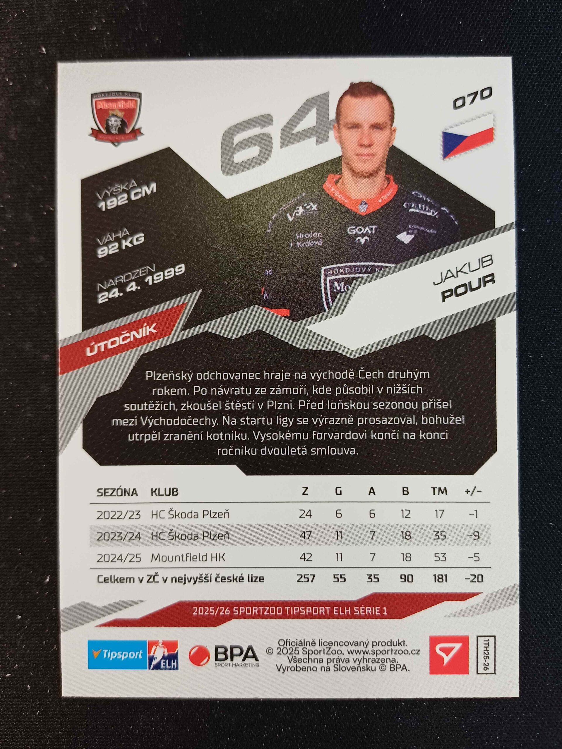 Sběratelská karta 2025/2026 Sportzoo Serie 1 Base 70 Jakub Pour