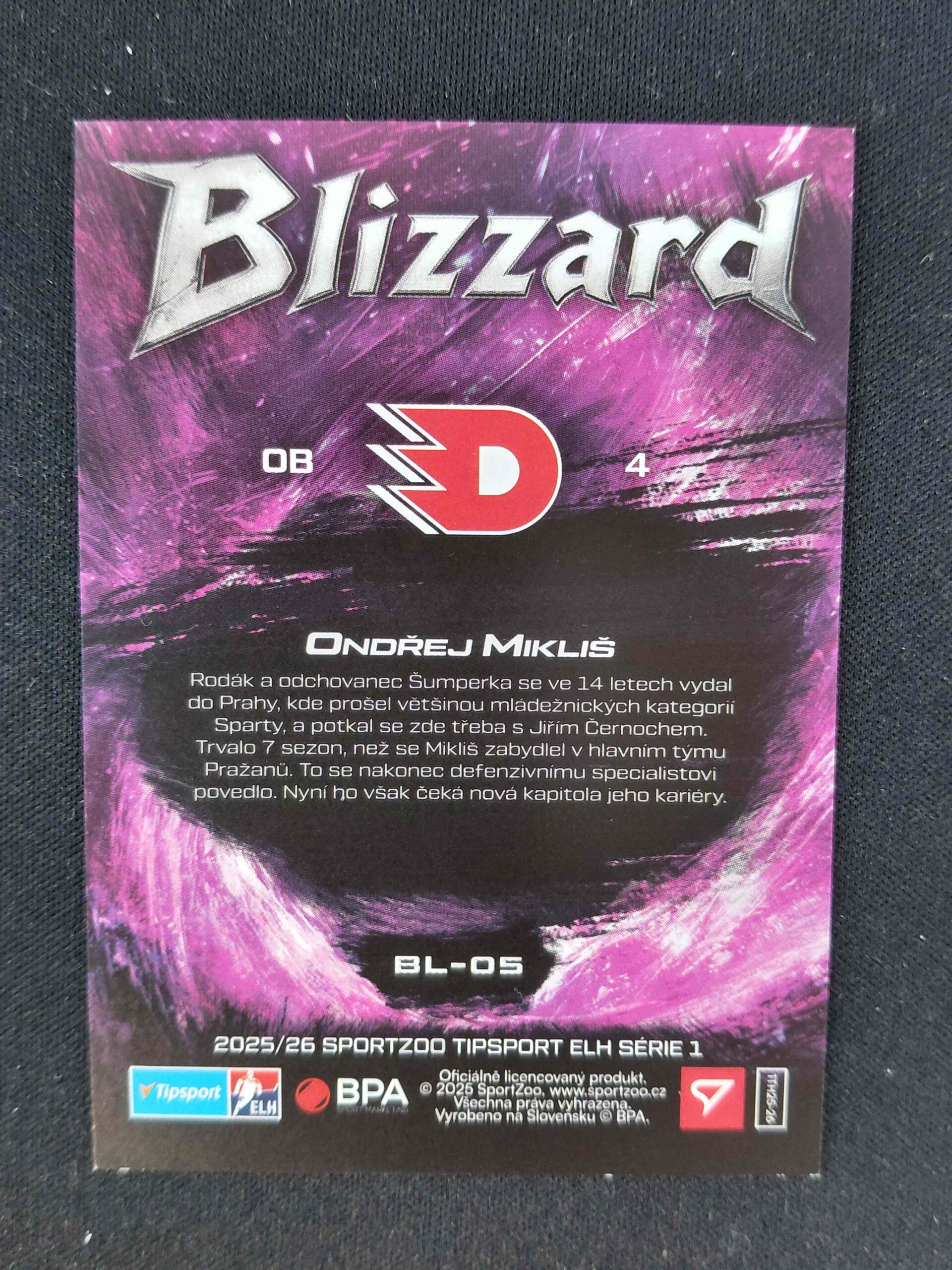 Sběratelská karta 2025/2026 Sportzoo Serie 1 Blizzard Coral Pink BL-05 Ondřej Mikliš Inzert 09/60