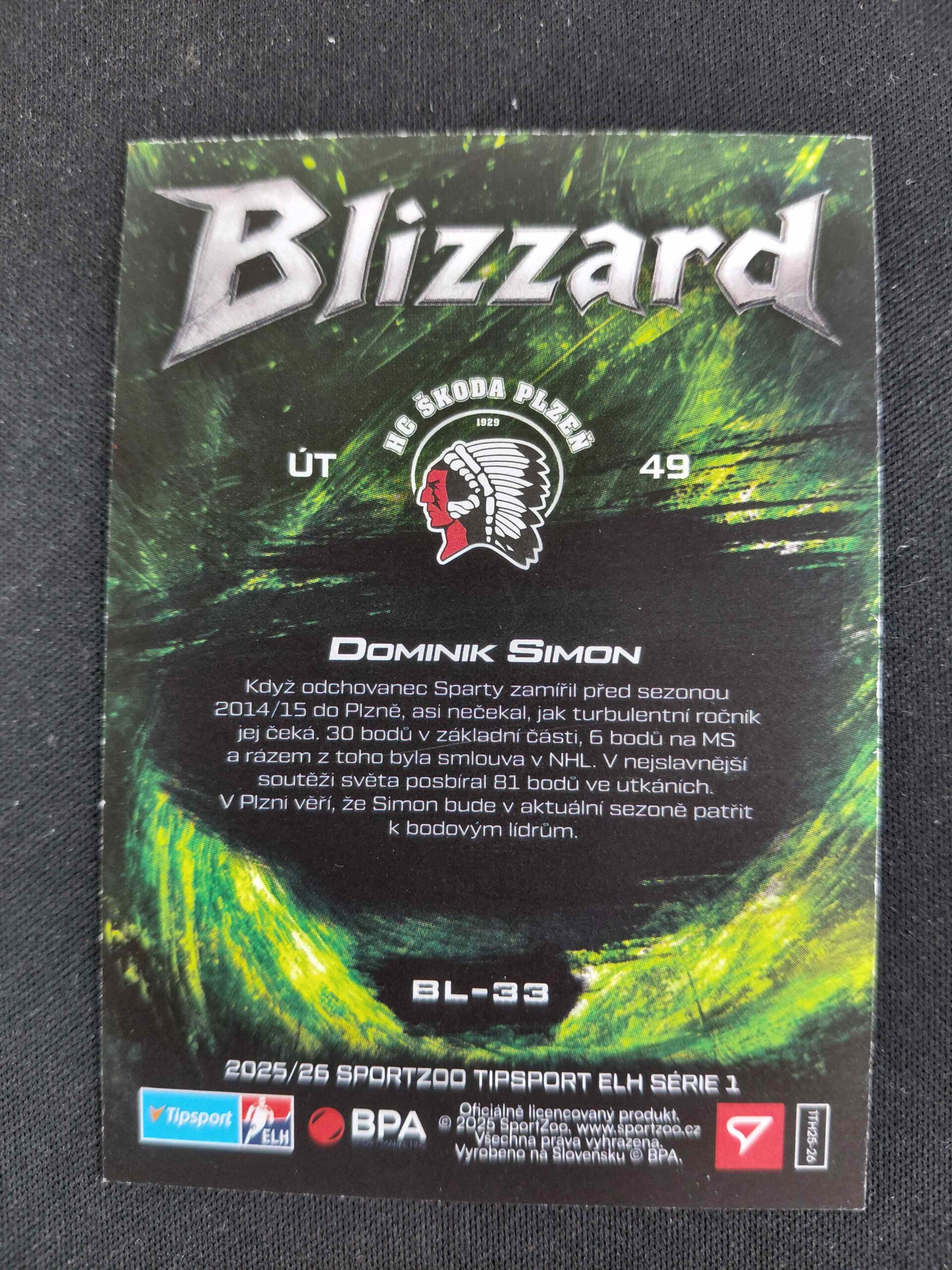 Sběratelská karta 2025/2026 Sportzoo Serie 1 Blizzard Forest Green BL-33 Dominik Simon Inzert 07/99