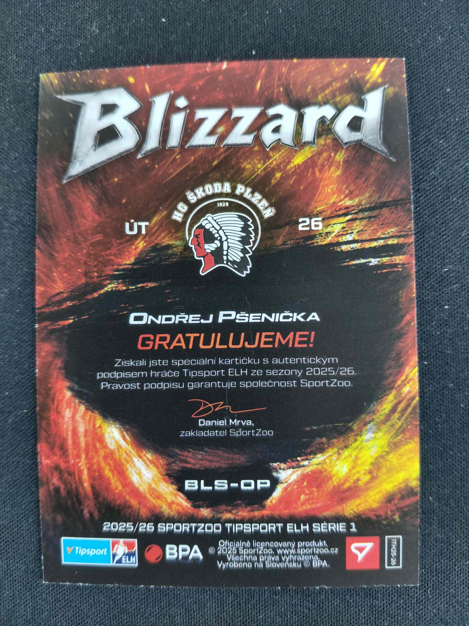 Sběratelská karta 2025/2026 Sportzoo Serie 1 Blizzard Red AUTO BLS-OP Ondřej Pšenička AUTO 02/55