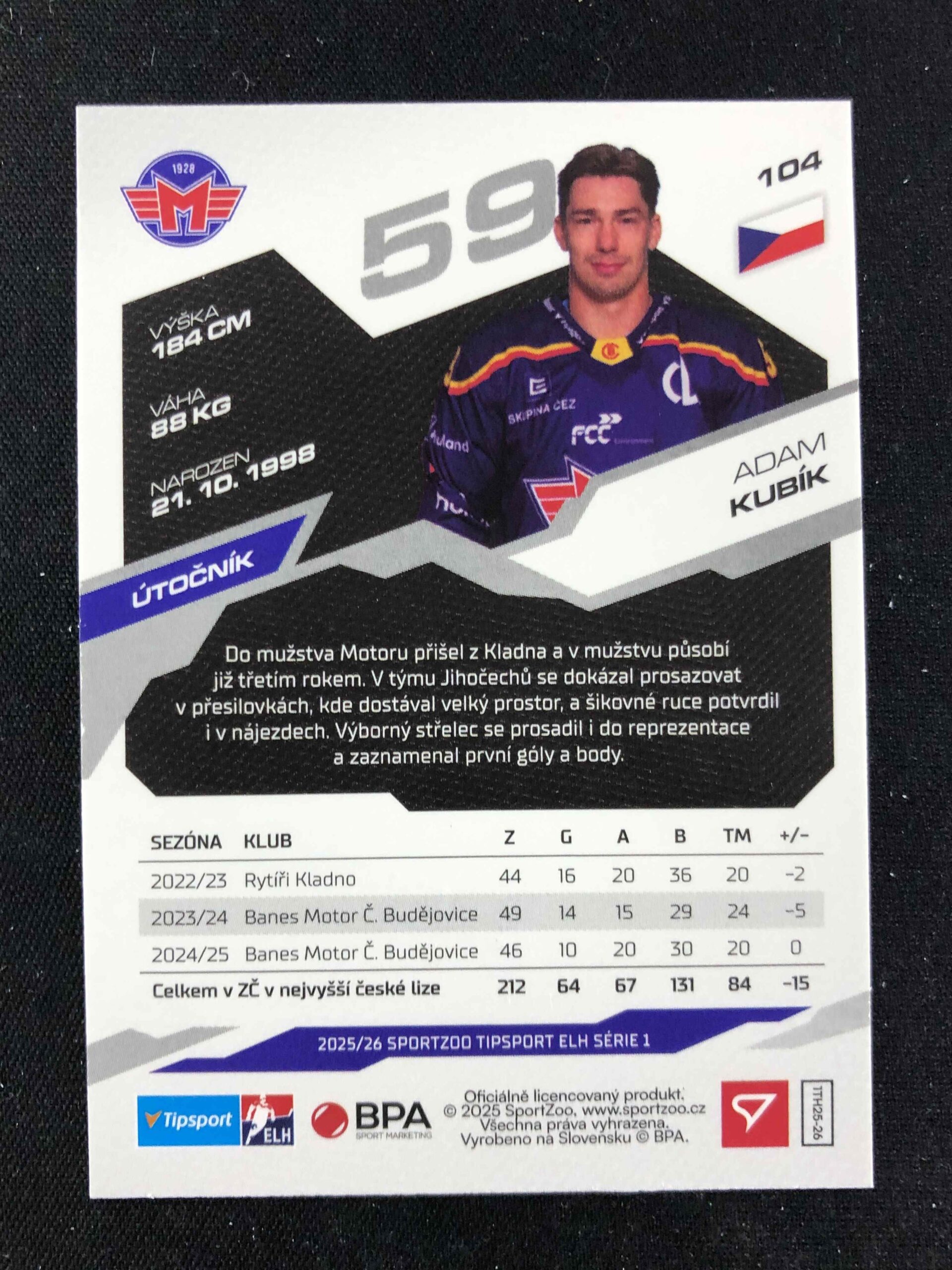 Sběratelská karta 2025/2026 Sportzoo Serie 1 Emerald Green 104 Adam Kubík Paralel 32/50