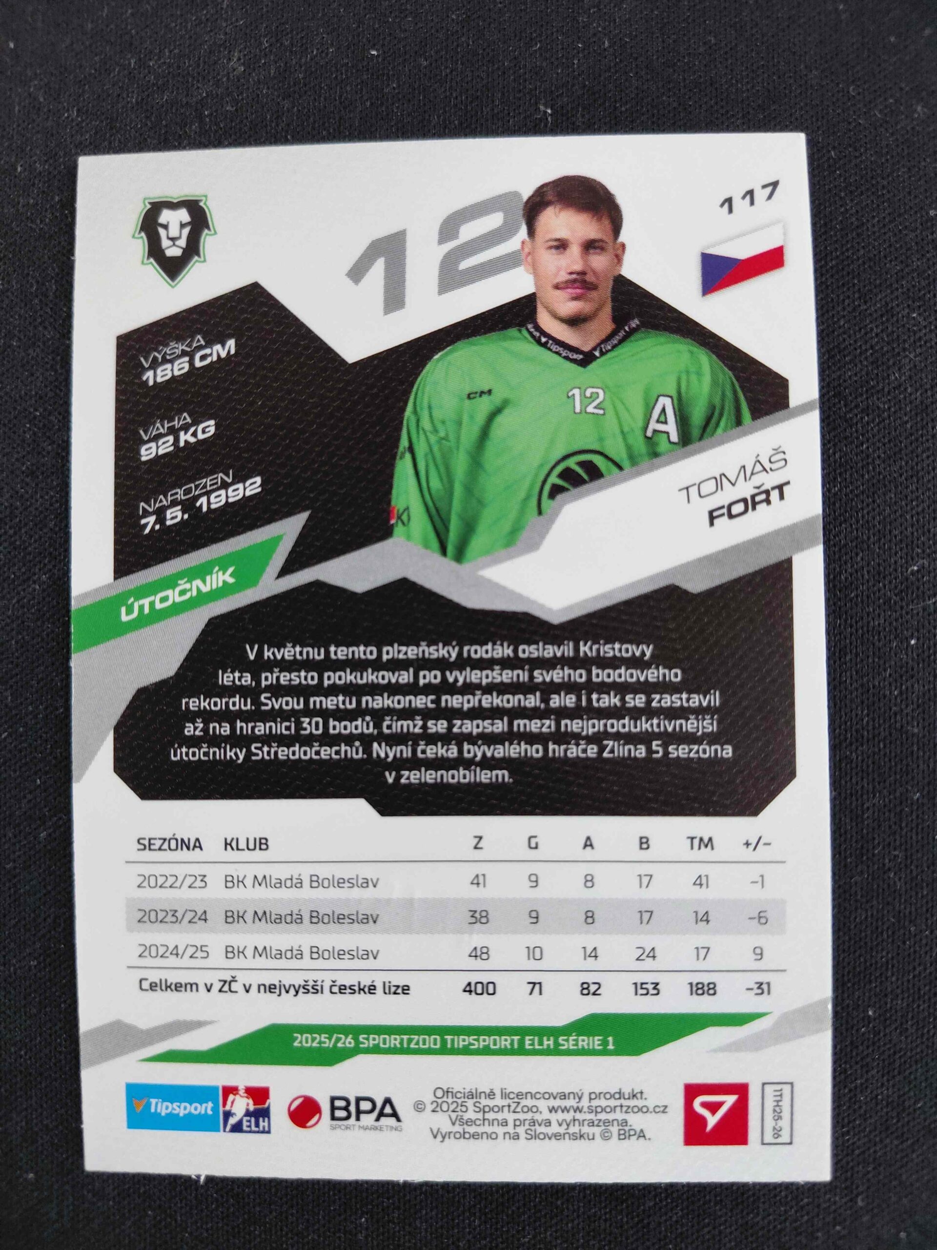 Sběratelská karta 2025/2026 Sportzoo Serie 1 Emerald Green 117 Tomáš Fořt Paralel 44/50