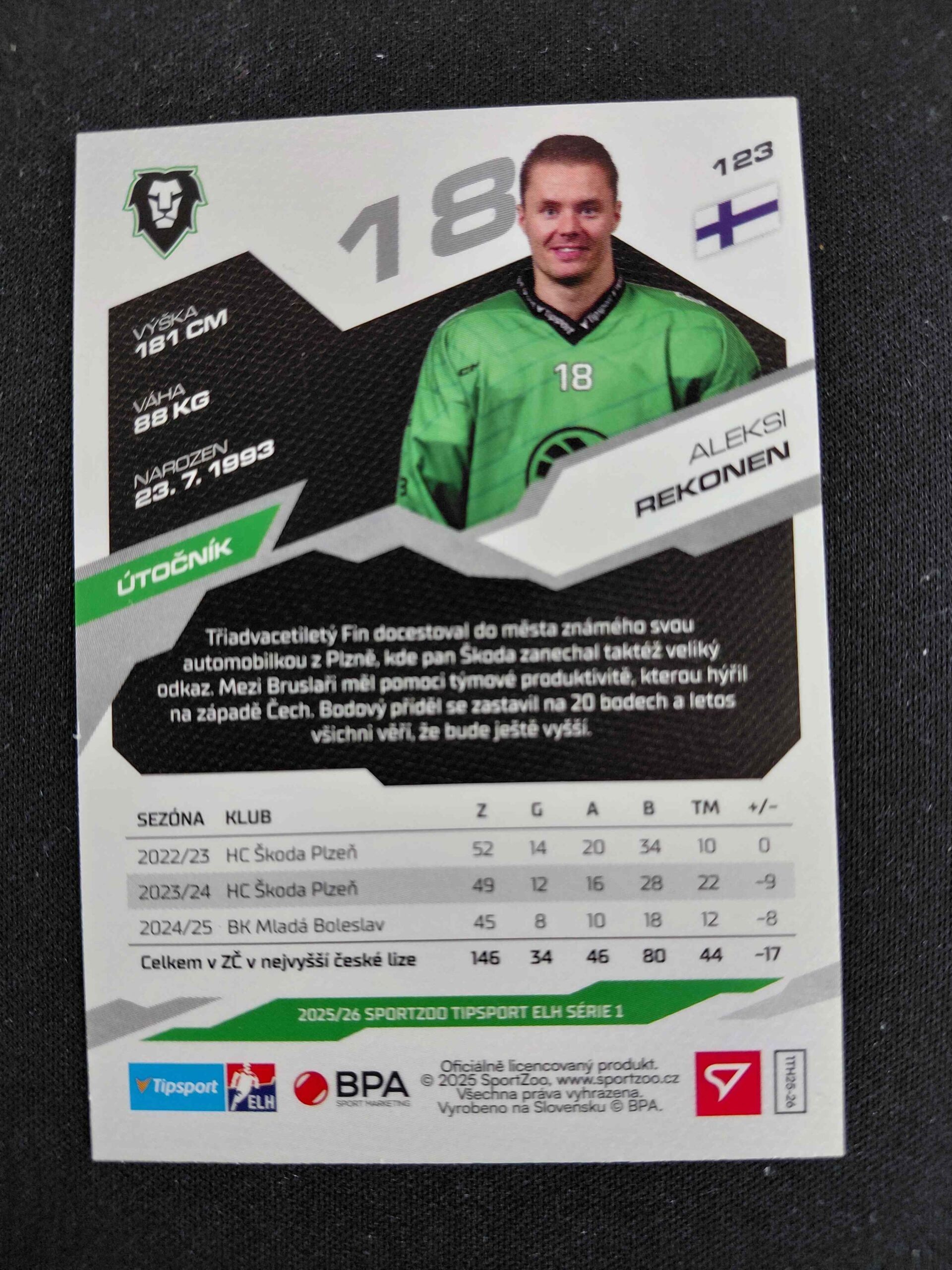 Sběratelská karta 2025/2026 Sportzoo Serie 1 Emerald Green 123 Aleksi Rekonen Paralel 48/50