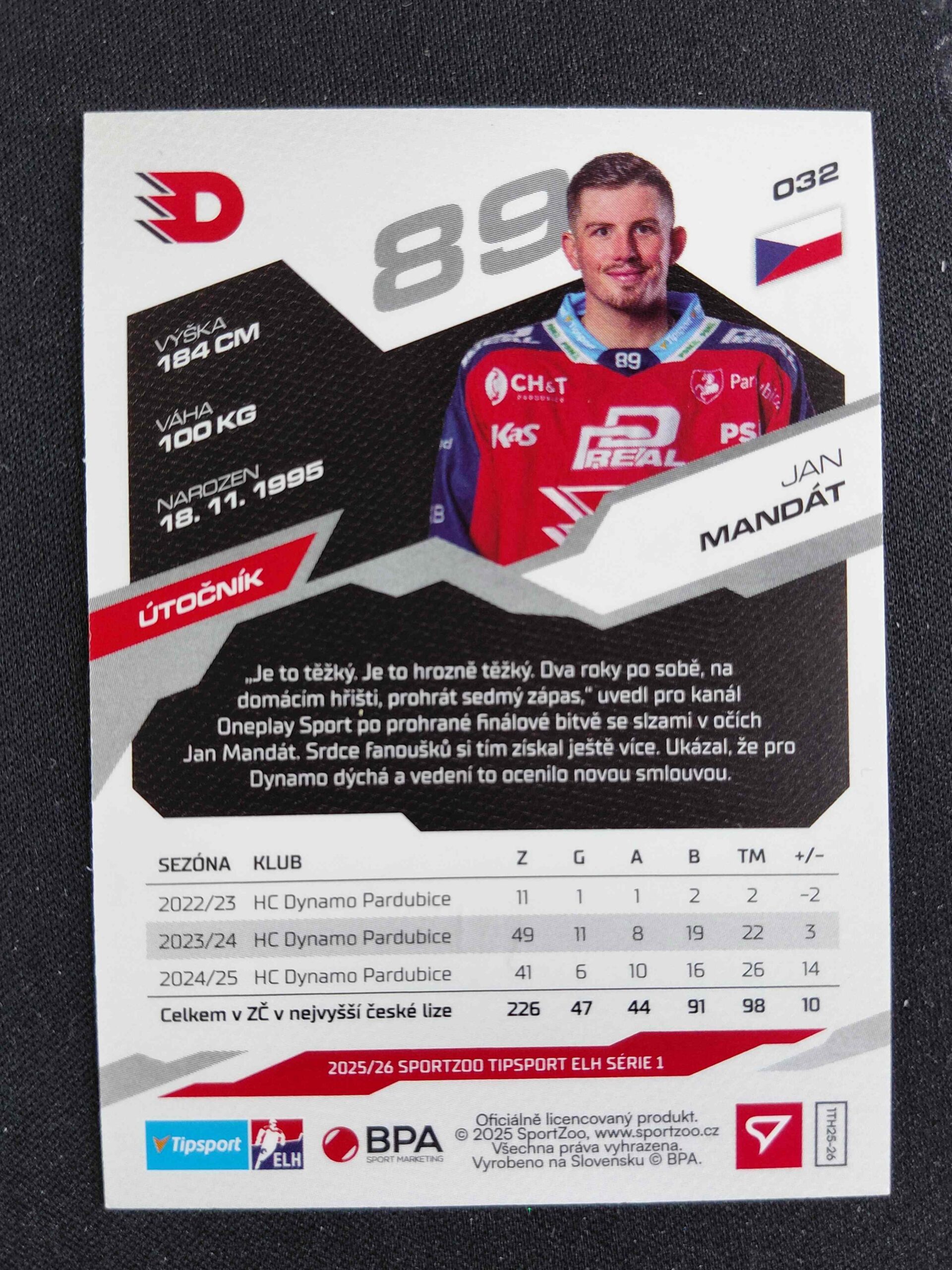 Sběratelská karta 2025/2026 Sportzoo Serie 1 Emerald Green 32 Jan Mandát Paralel 30/50