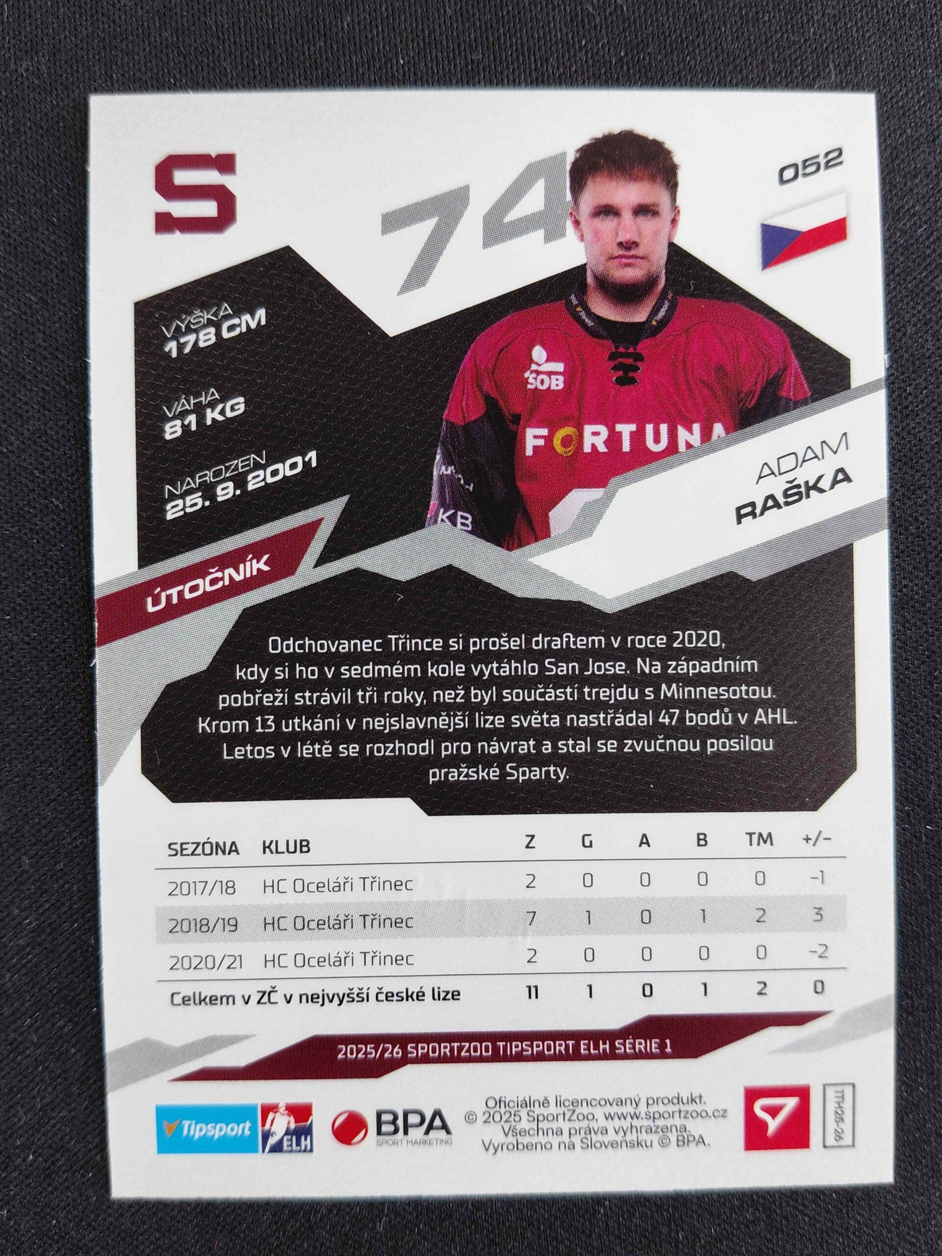 Sběratelská karta 2025/2026 Sportzoo Serie 1 Emerald Green 52 Adam Raška Paralel 44/50