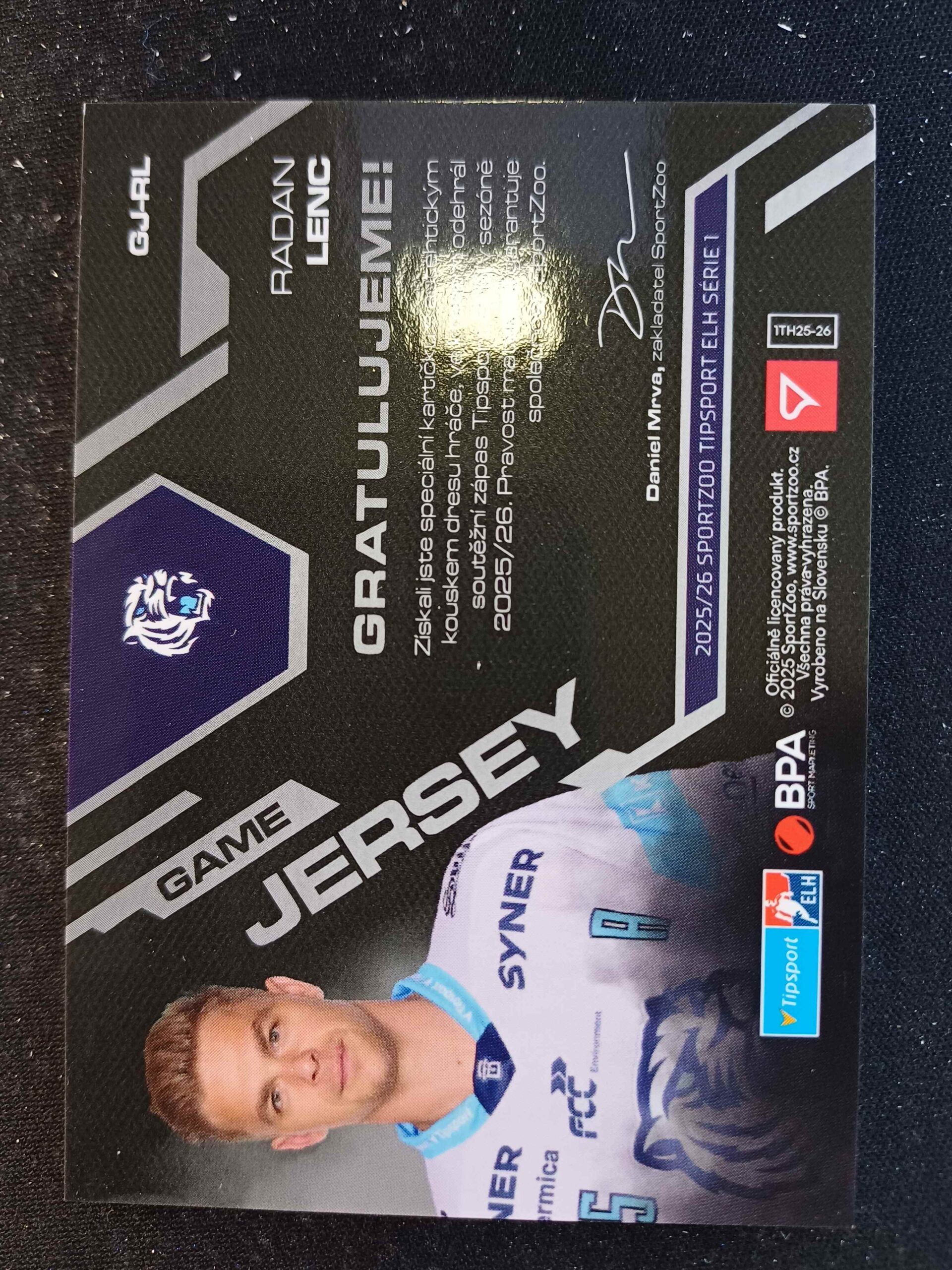 Sběratelská karta 2025/2026 Sportzoo Serie 1 Game Jersey GJ-RL Radan Lenc Jersey 51/85