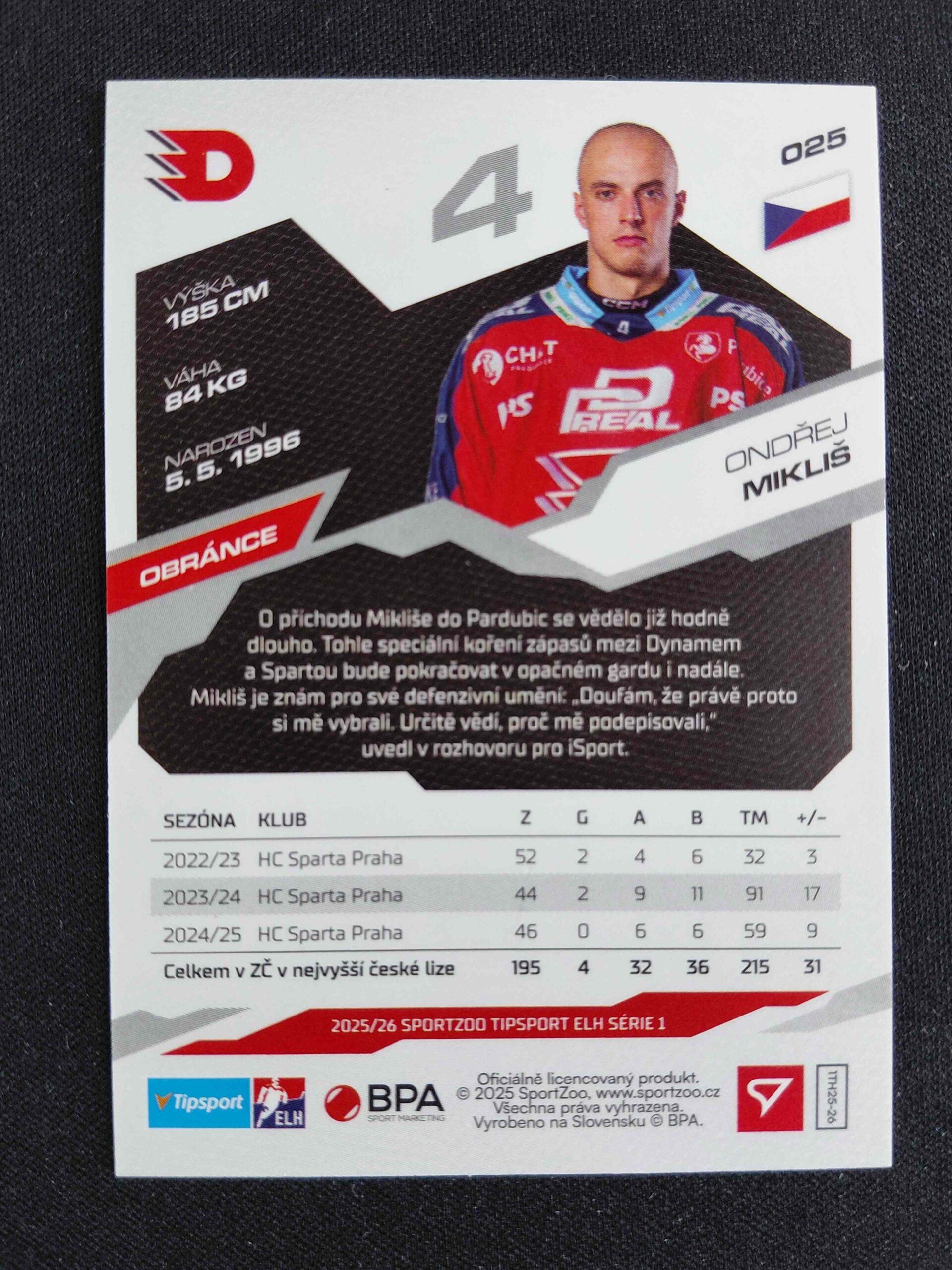 Sběratelská karta 2025/2026 Sportzoo Serie 1 Ruby Red 25 Ondřej Mikliš Paralel 11/25