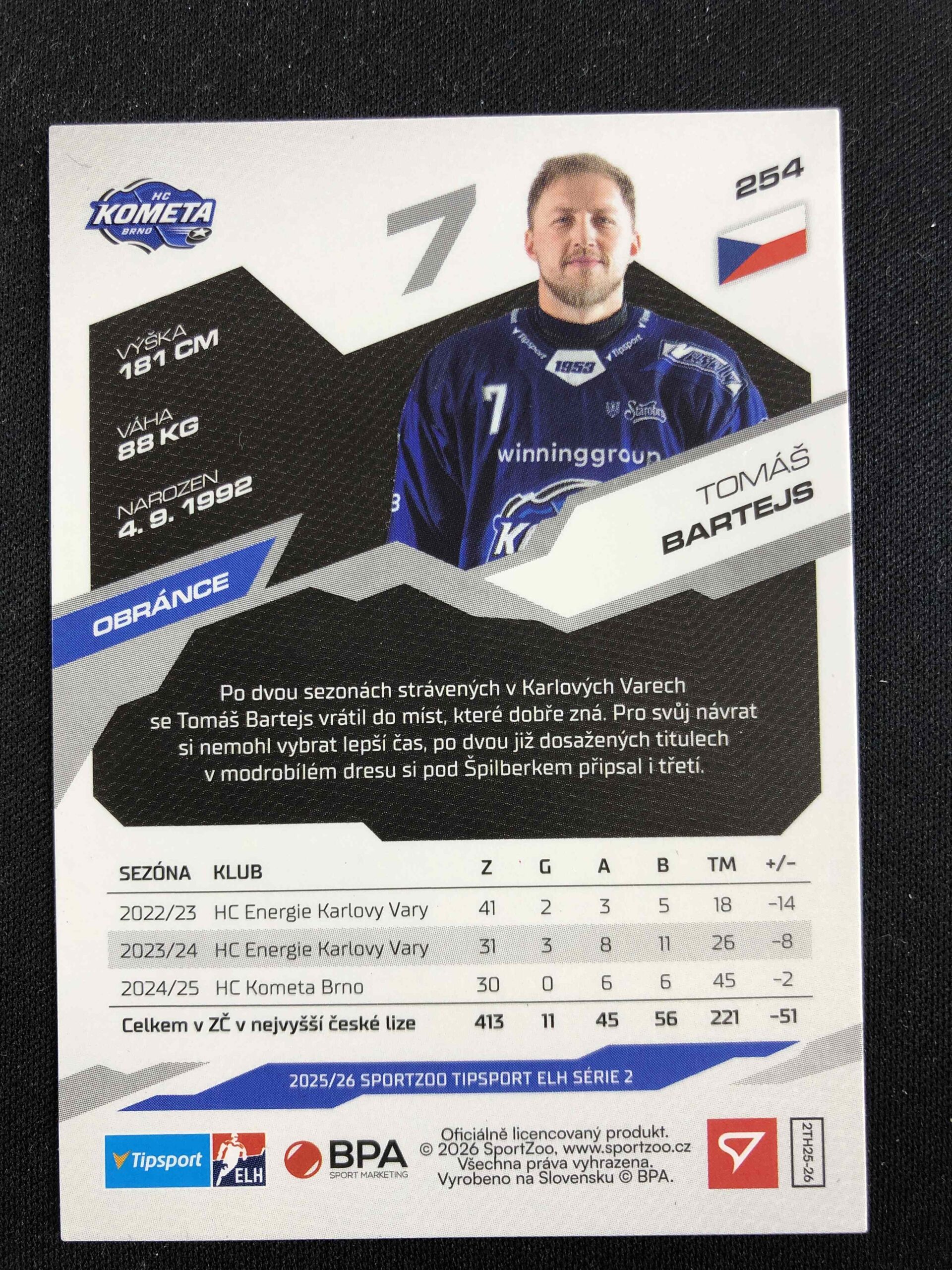 Sběratelská karta 2025/2026 Sportzoo Serie 2 Azure Blue 254 Tomáš Bartejs Paralel