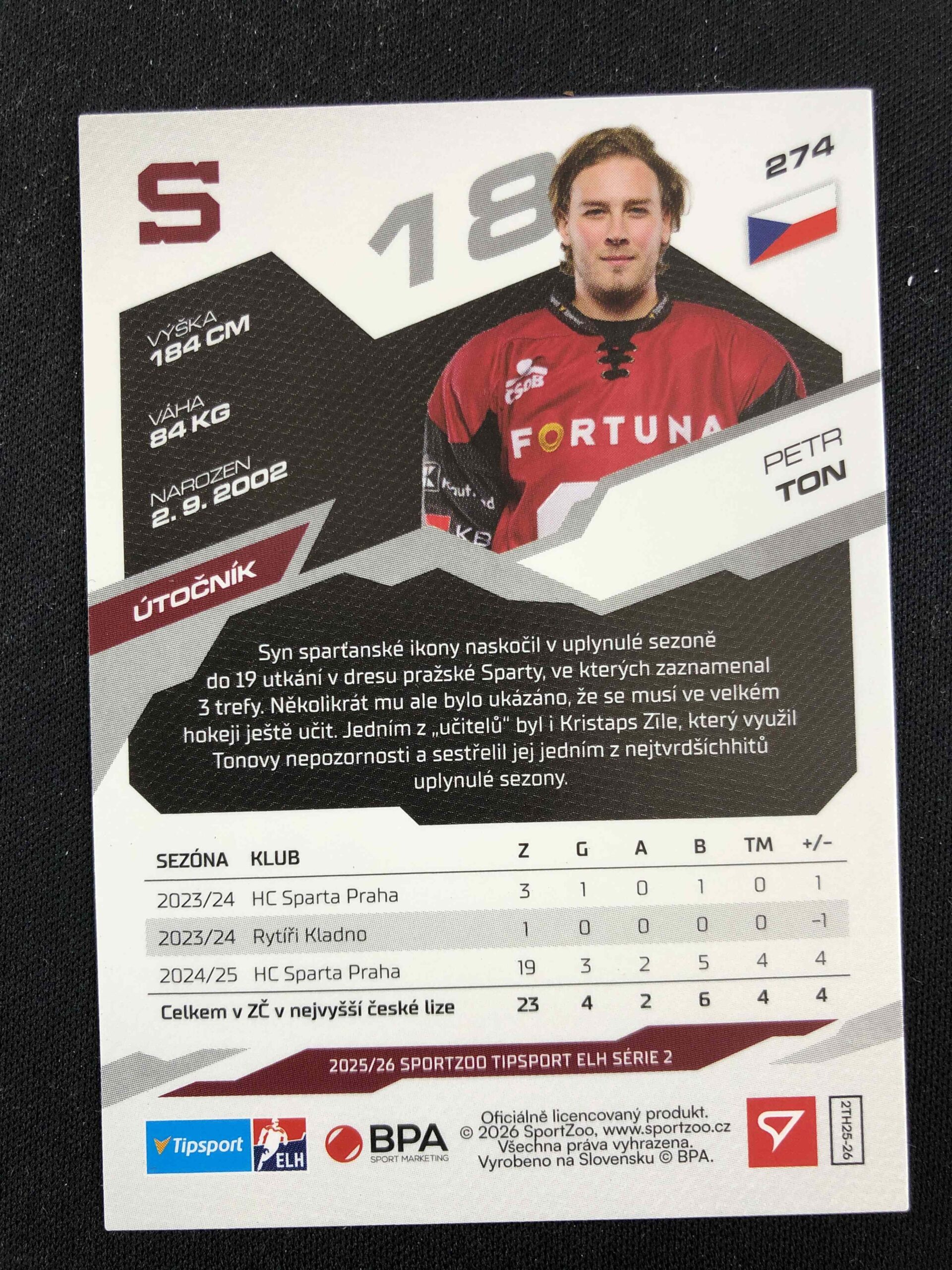 Sběratelská karta 2025/2026 Sportzoo Serie 2 Azure Blue 274 Petr Ton Paralel
