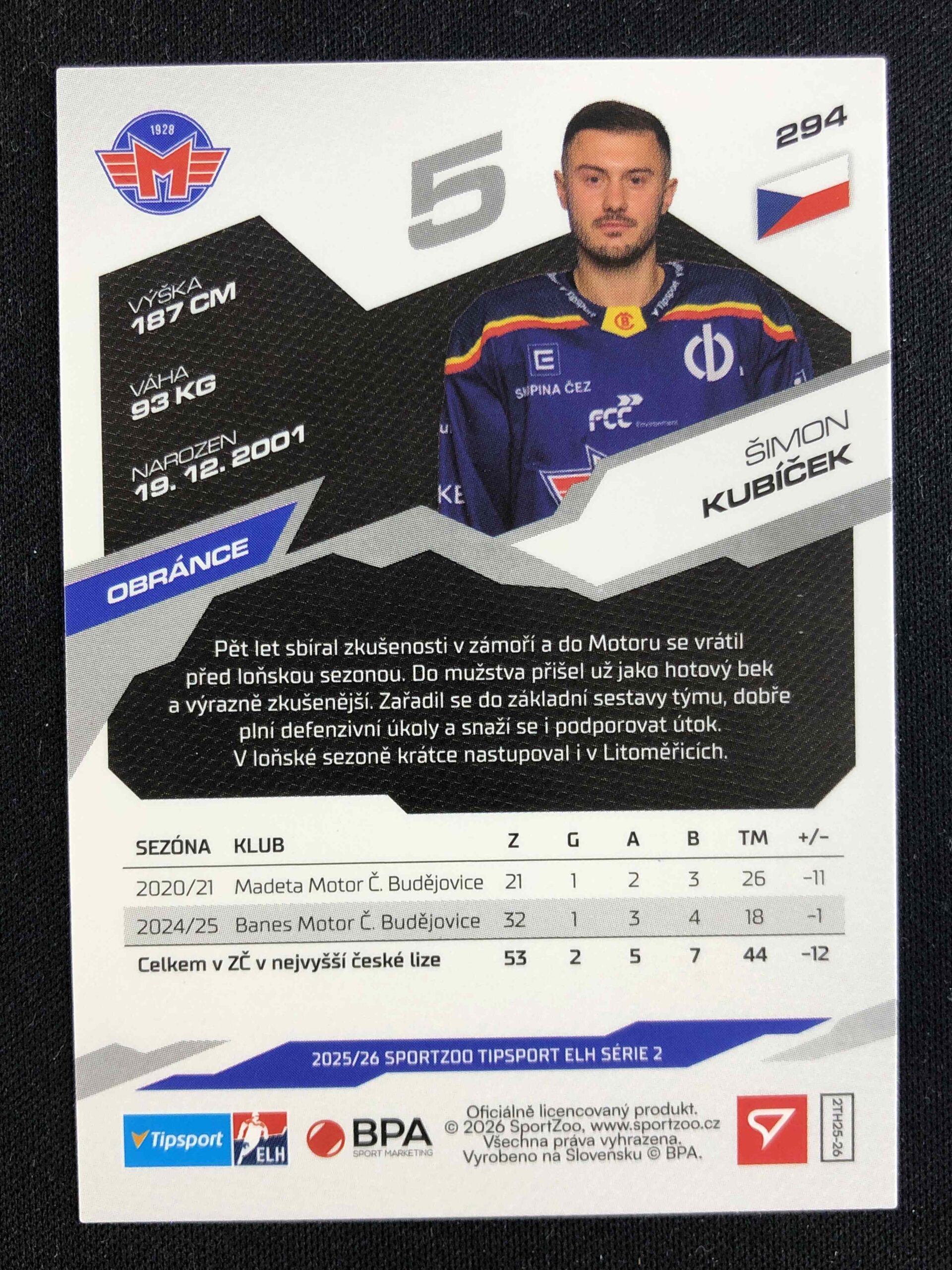 Sběratelská karta 2025/2026 Sportzoo Serie 2 Azure Blue 294 Šimon Kubíček Paralel