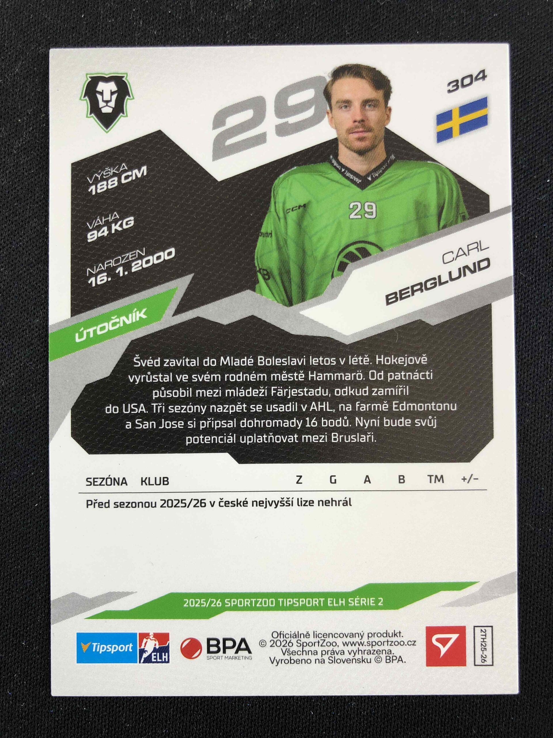 Sběratelská karta 2025/2026 Sportzoo Serie 2 Azure Blue 304 Carl Berglund Paralel