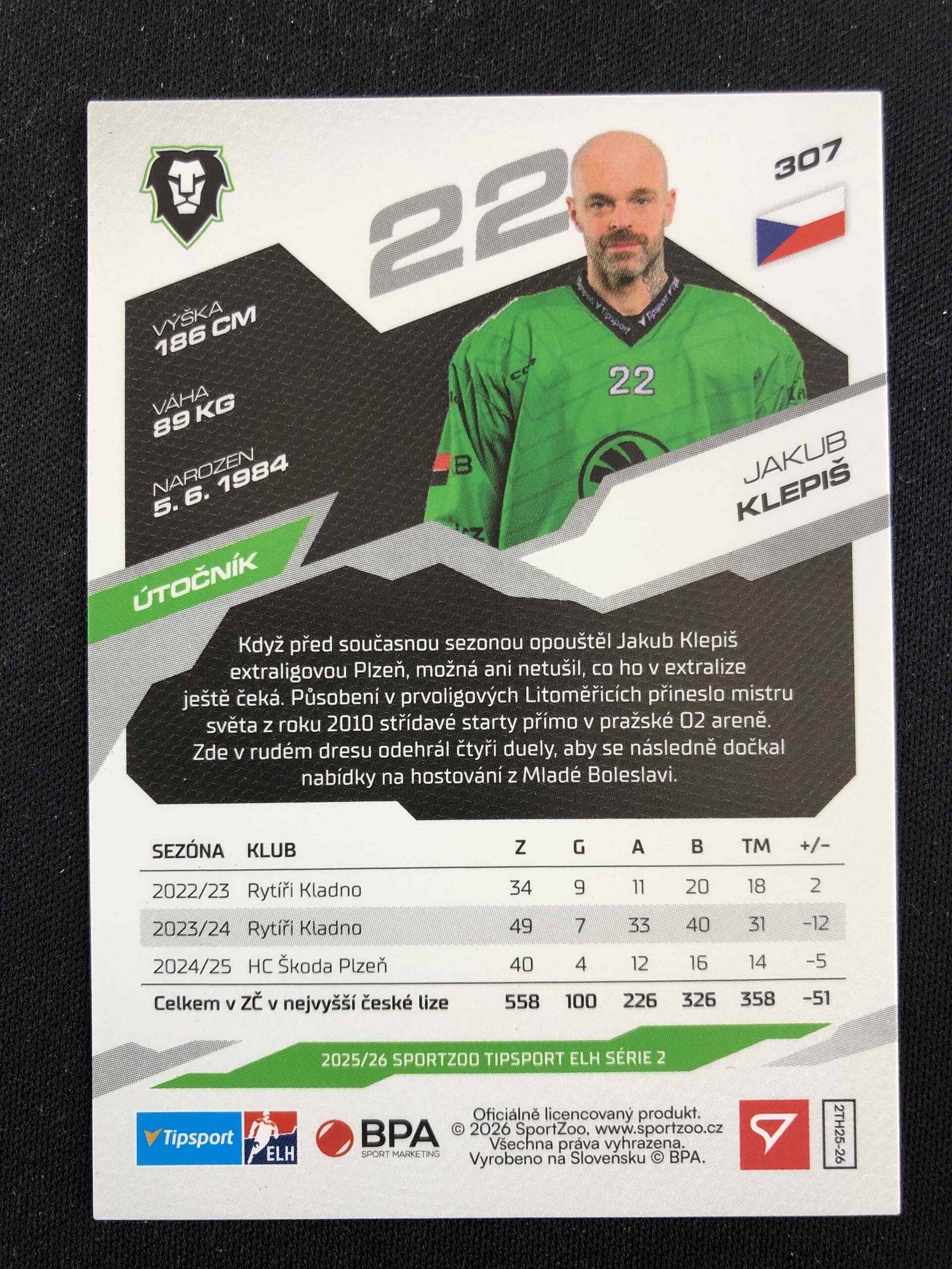 Sběratelská karta 2025/2026 Sportzoo Serie 2 Azure Blue 307 Jakub Klepiš Paralel