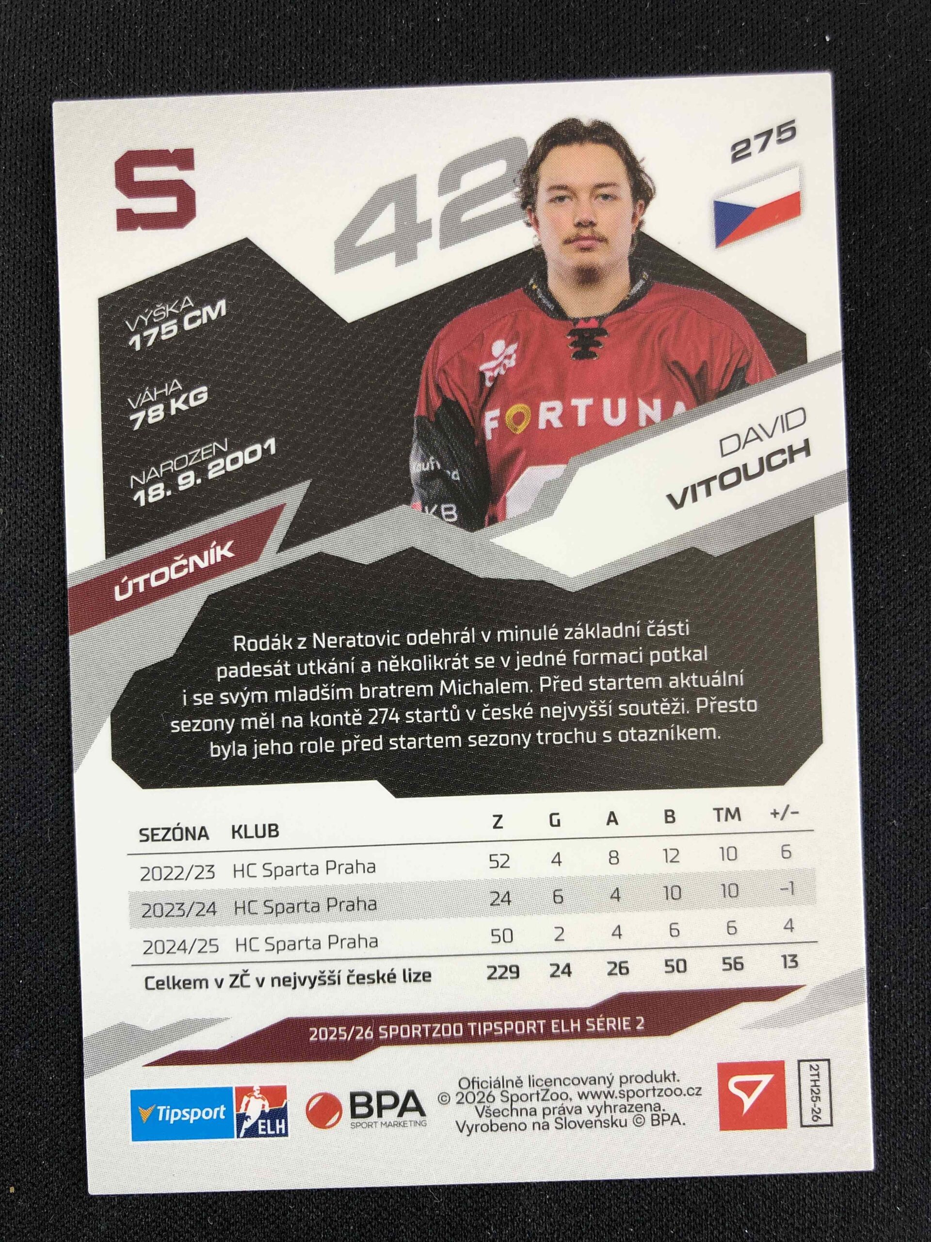 Sběratelská karta 2025/2026 Sportzoo Serie 2 Base 275 David Vitouch
