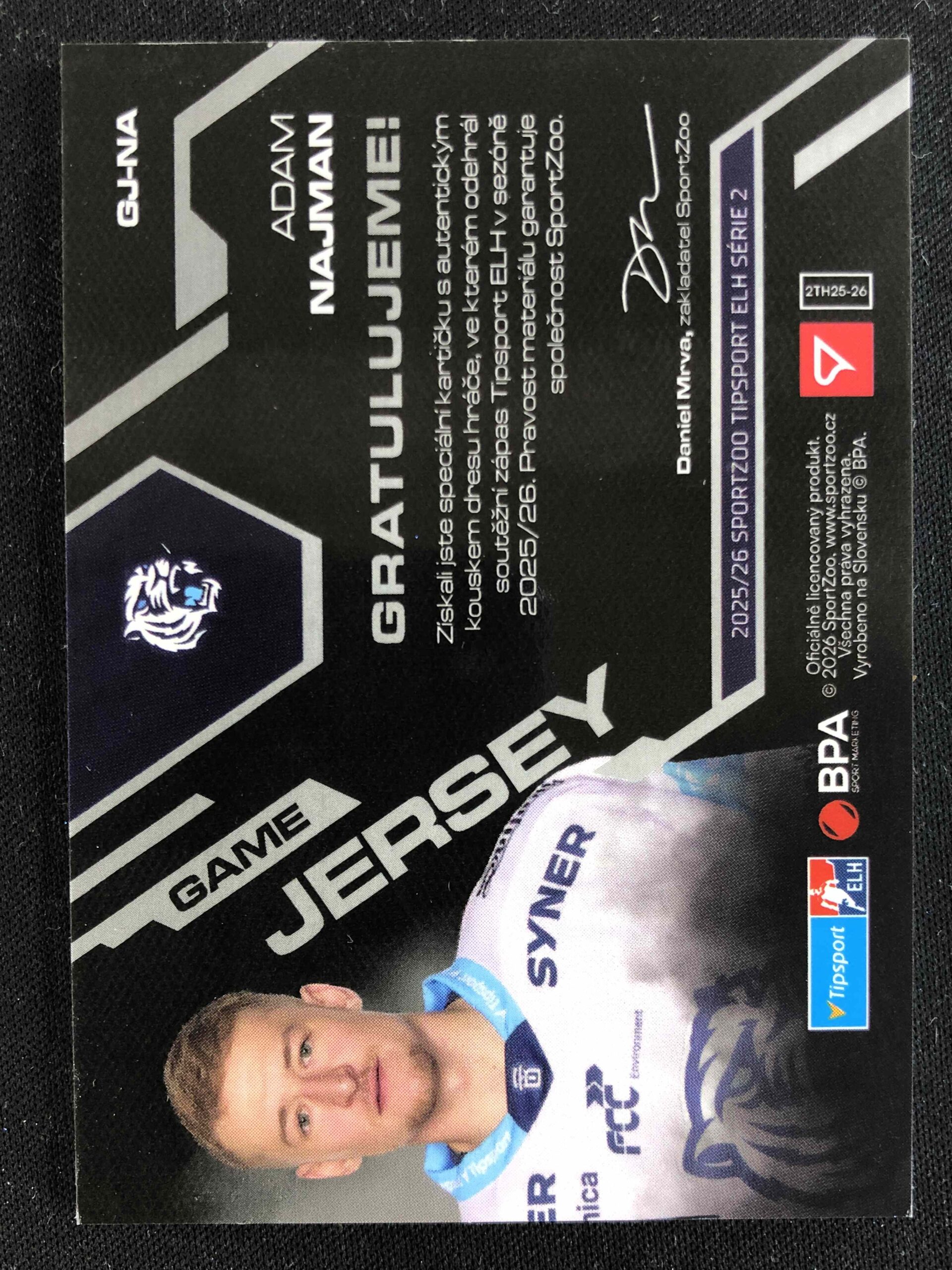 Sběratelská karta 2025/2026 Sportzoo Serie 2 Game Jersey Silver GJ-NA Adam Najman Jersey 67/85