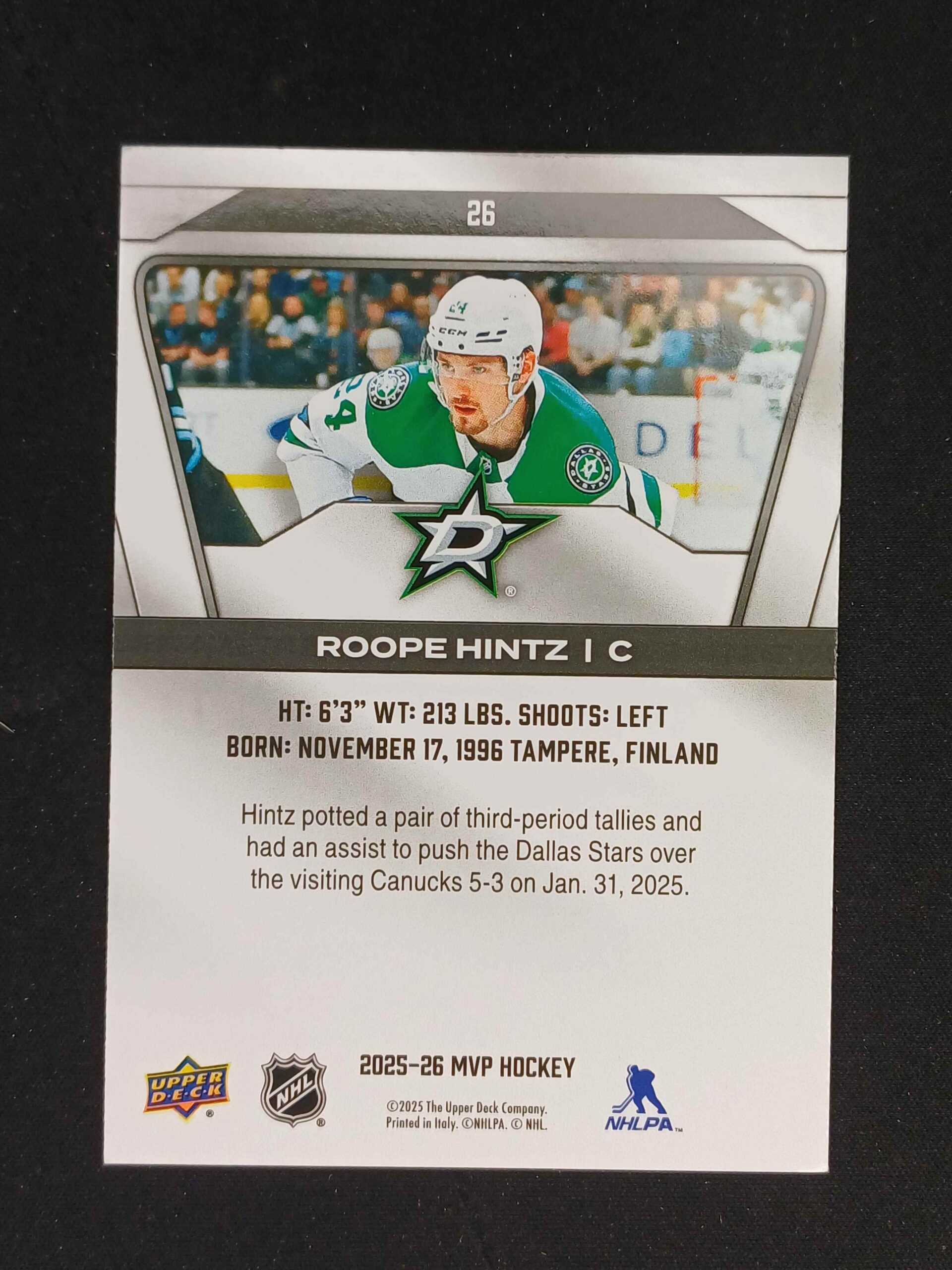 Sběratelská karta 2025/2026 Upper Deck MVP Base 26 Roope Hintz