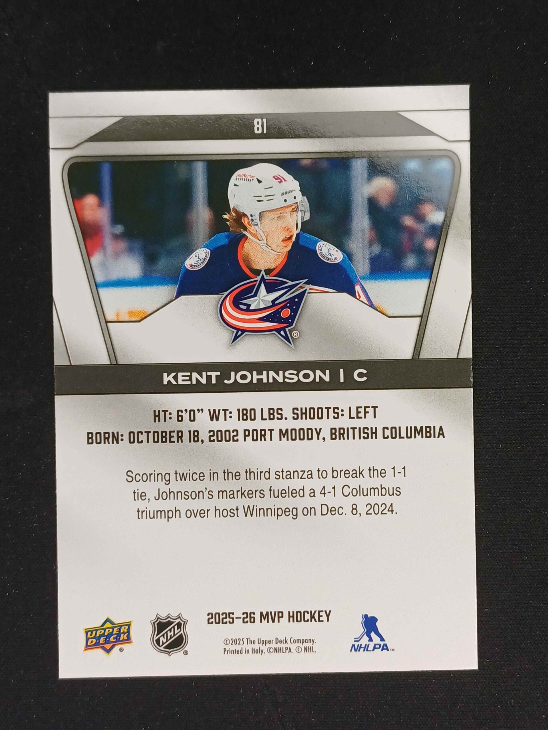 Sběratelská karta 2025/2026 Upper Deck MVP Base 81 Kent Johnson