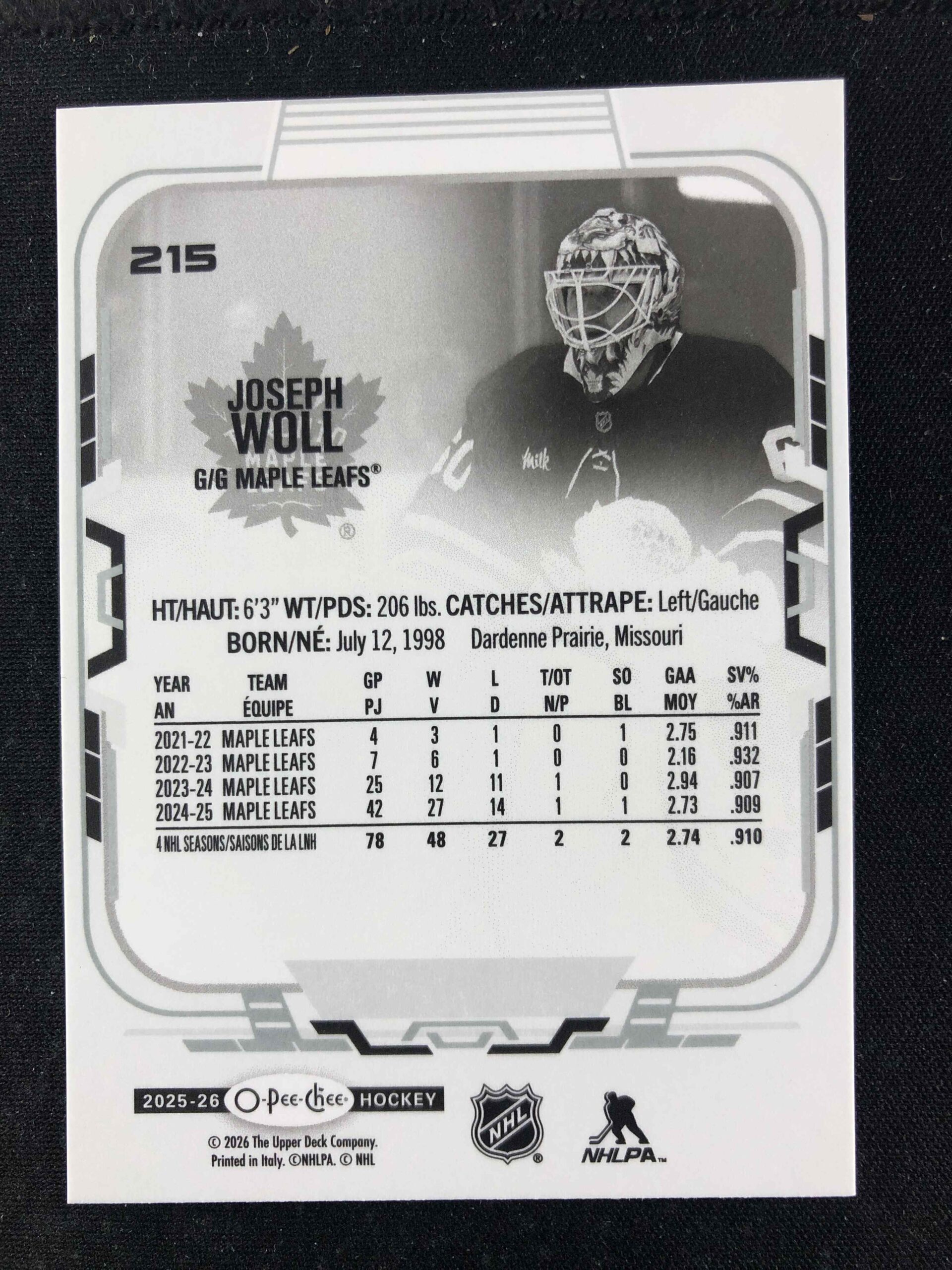 Sběratelská karta 2025/2026 Upper Deck O-Pee-Chee Base 215 Joseph Woll